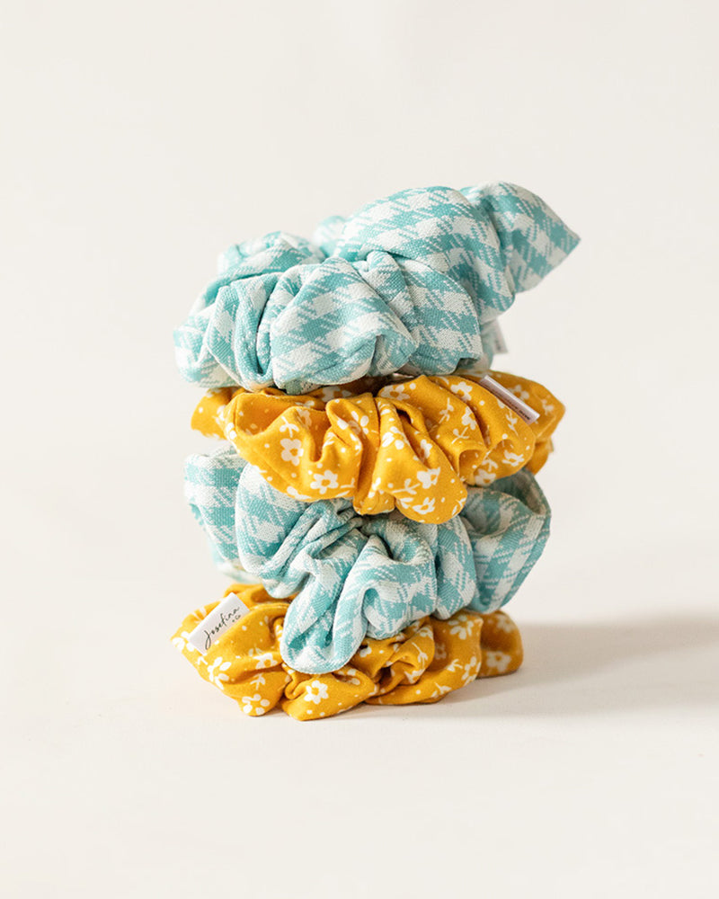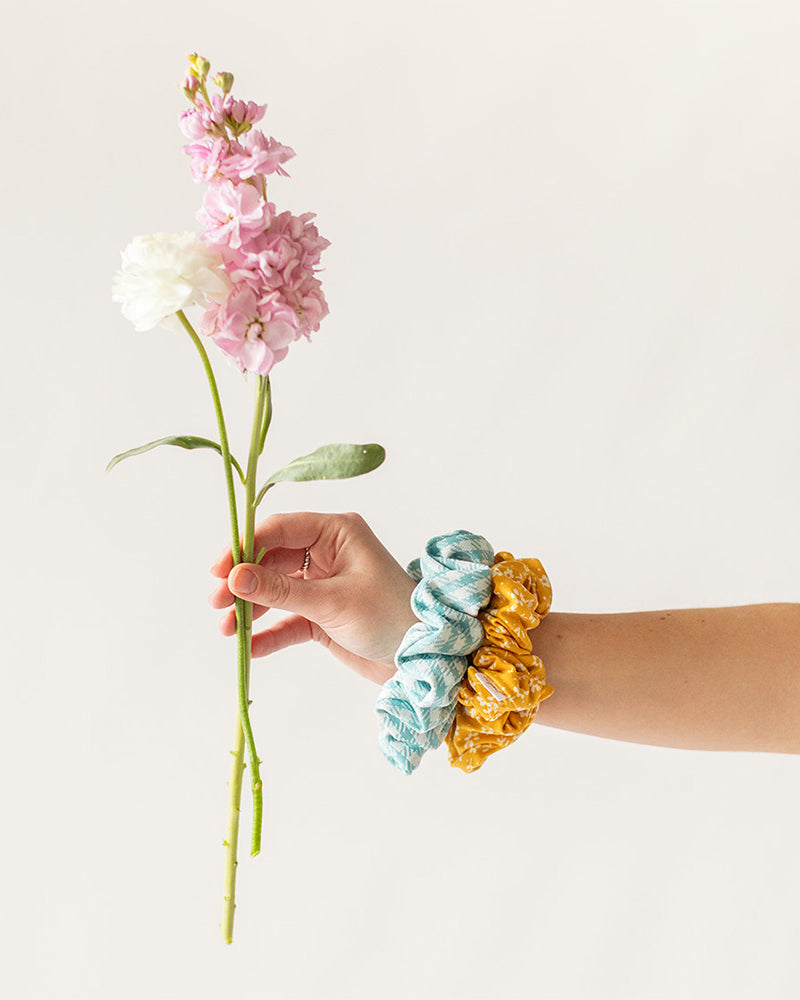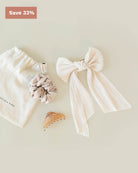 This stunning three-piece set includes a French Ribbed Nude Blush Scrunchie, a Honey French Claw Clip and a gorgeous Plisse Ivory Bow; the perfect assortment to create any style you're looking for with elegance and ease! The kit comes in an adorable drawstring bag, which also makes it a great gift idea!