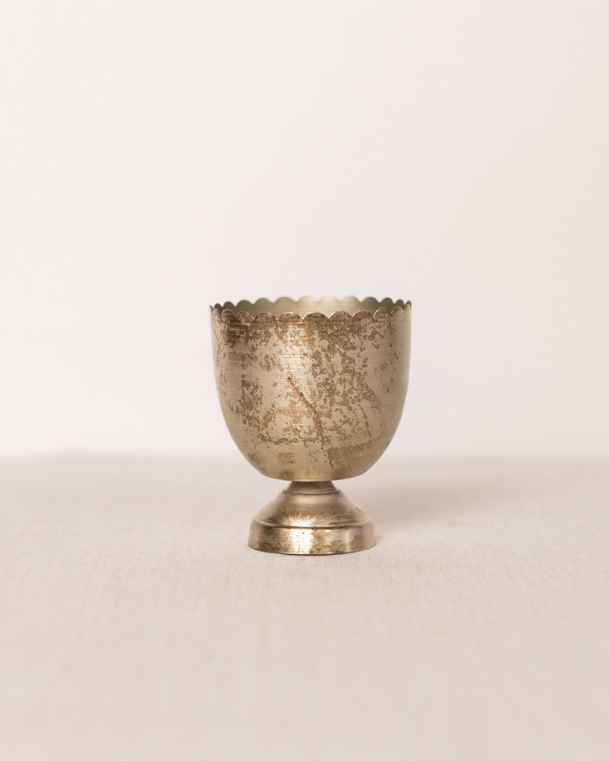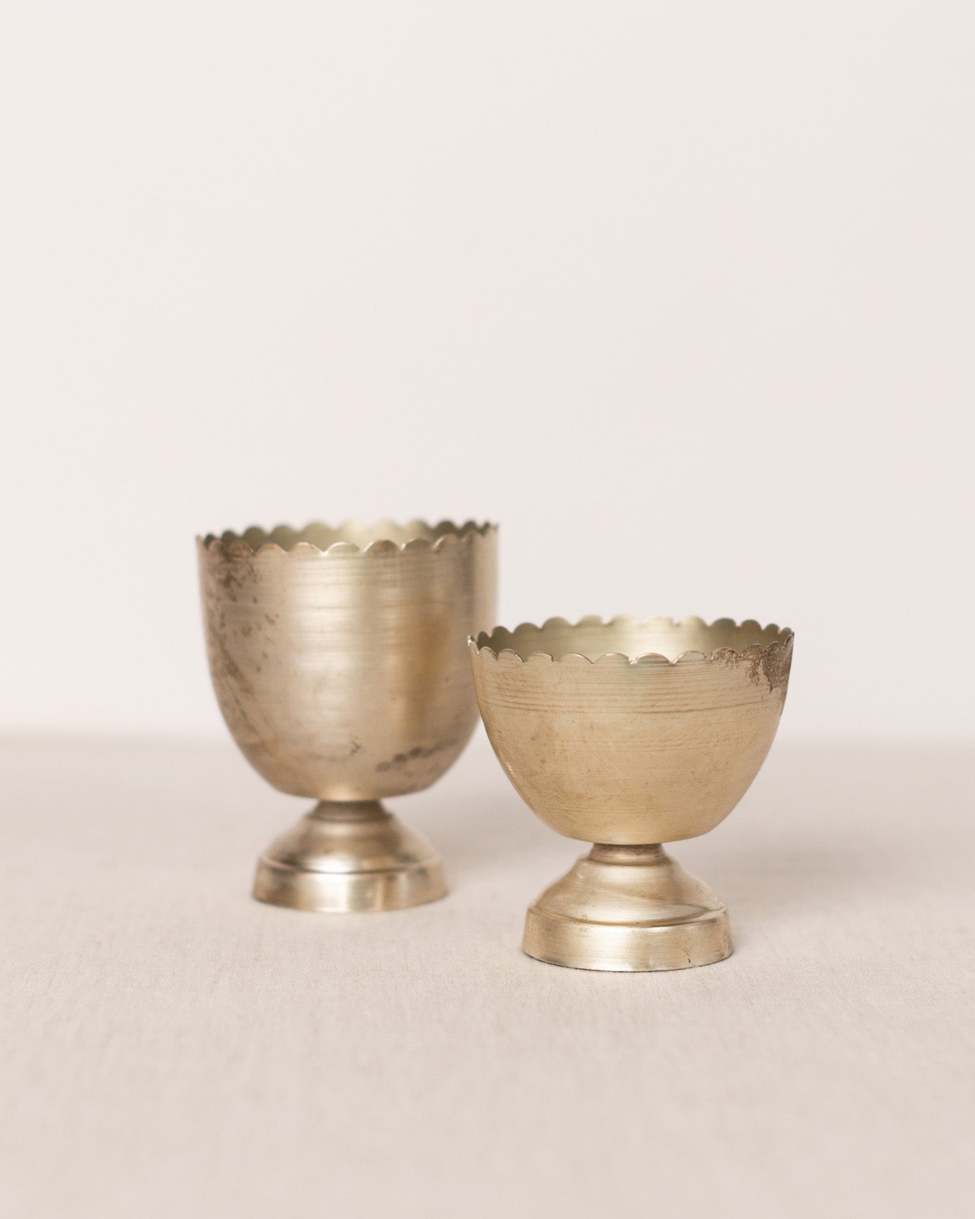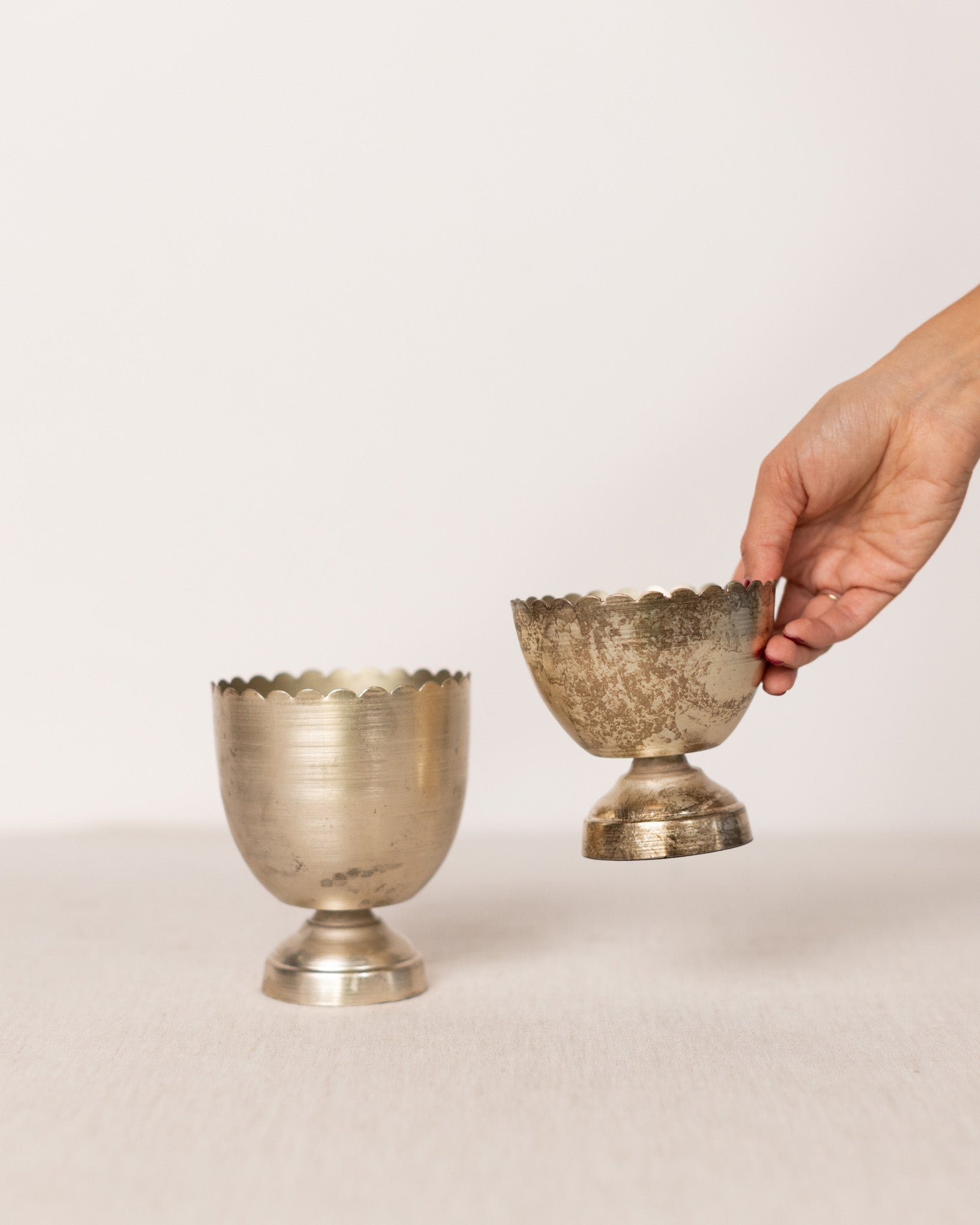This set of two iron footed bowls features graceful scalloped rims and an antique silver finish, adding elegance to any shelf, table, or vignette. Perfect for holding treats, trinkets, or holiday decor accents.