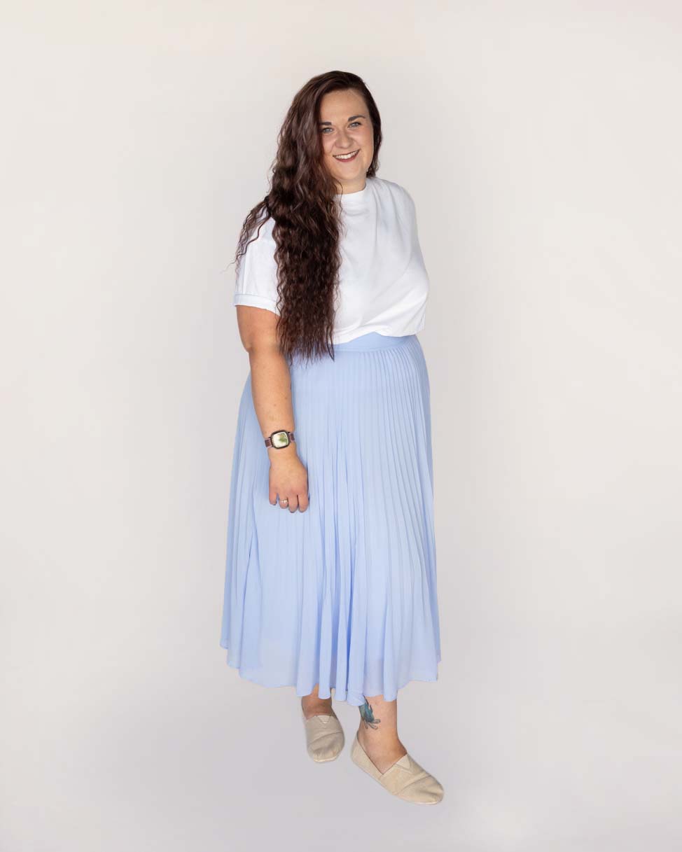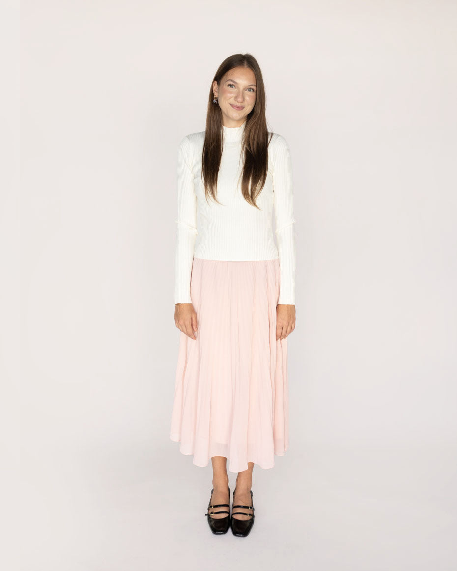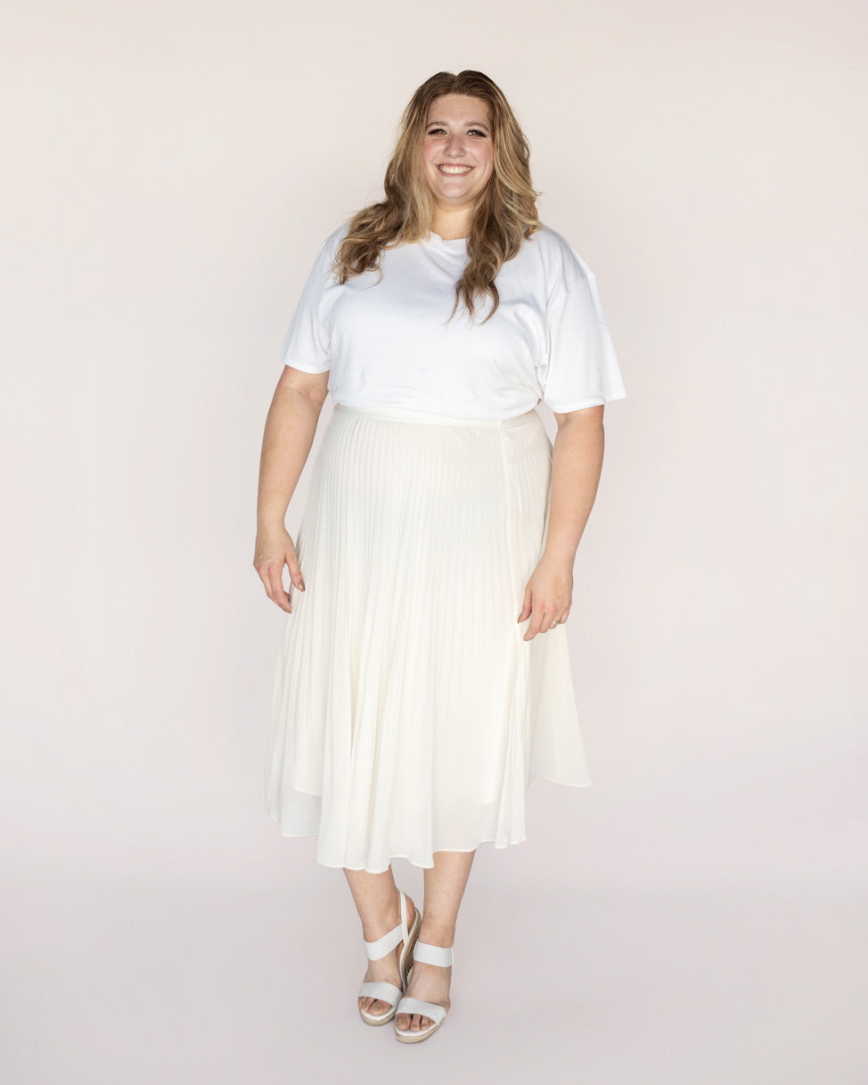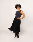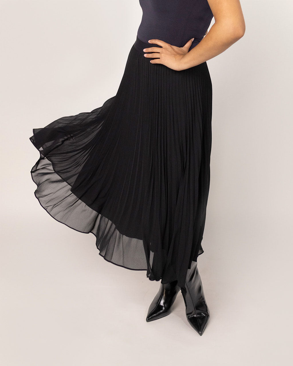 This high-rise midi features a comfy elastic waistband, full lining, and delicate sunburst pleats. Now in six stunning shades, including the new Winterberry and Black shades, this timeless skirt is flattering, versatile, and endlessly twirl-worthy.