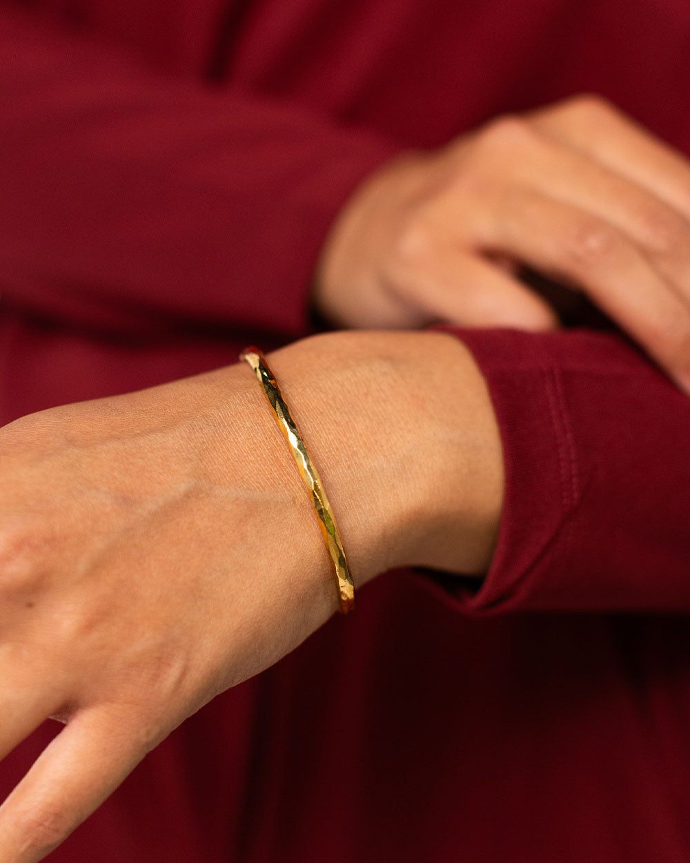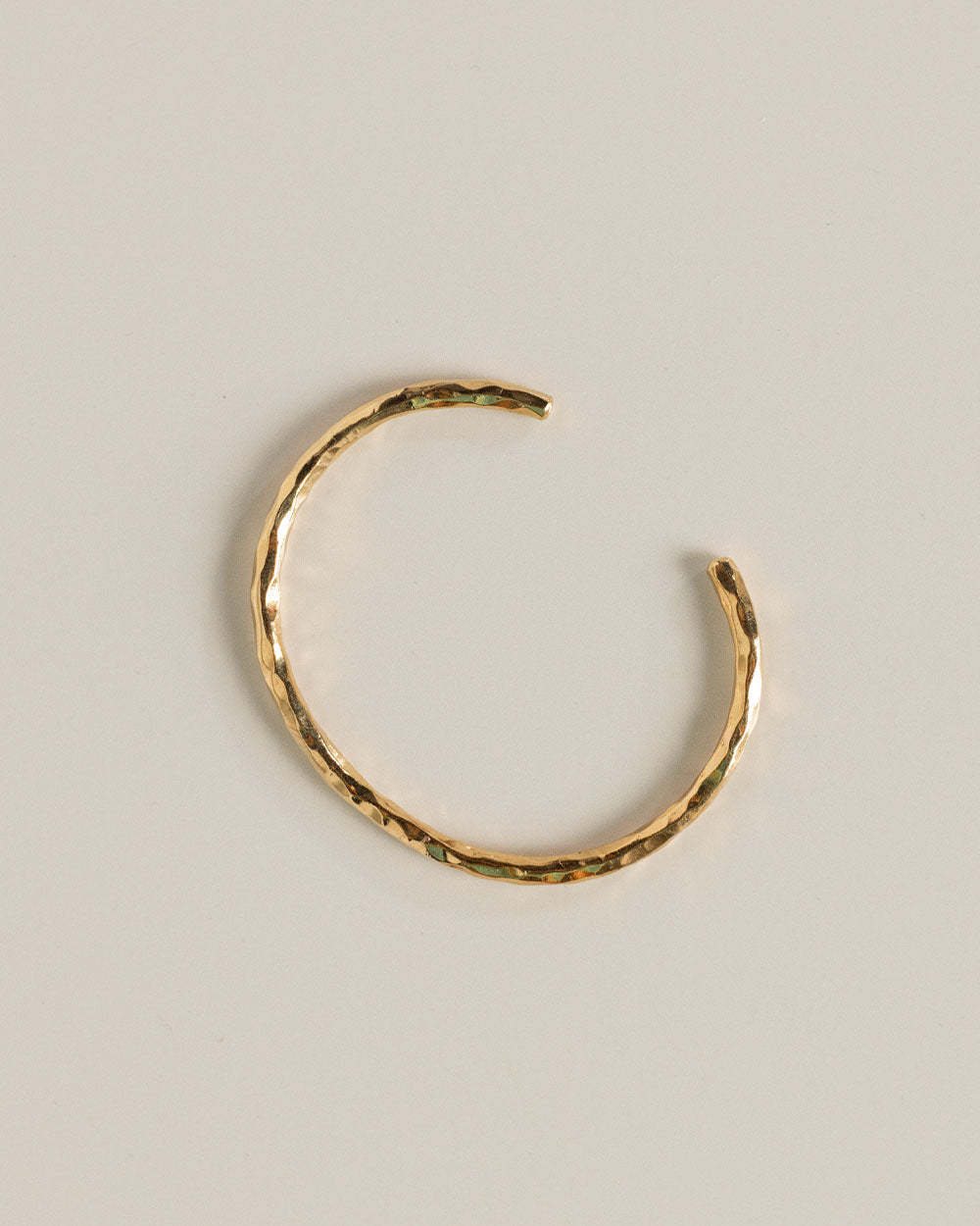 Handmade from salvaged scrap metal and finished with 18kt gold plating, this cuff is as meaningful as it is beautiful. Each piece is unique, with hammered textures that shimmer in the light and highlight its artisanal design.
