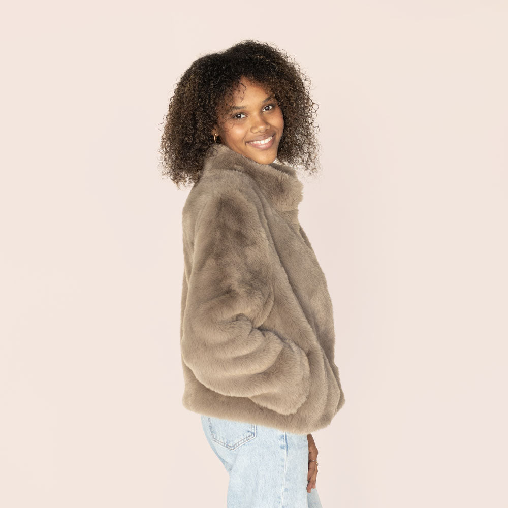 This coat is a boxy, relaxed fit and comes in two colours, a cafe brown and a dusty pink. Both are timeless colours that go with almost anything you’re wearing. Did we mention the coat has pockets? It really is the perfect winter coat to wear to your next party!