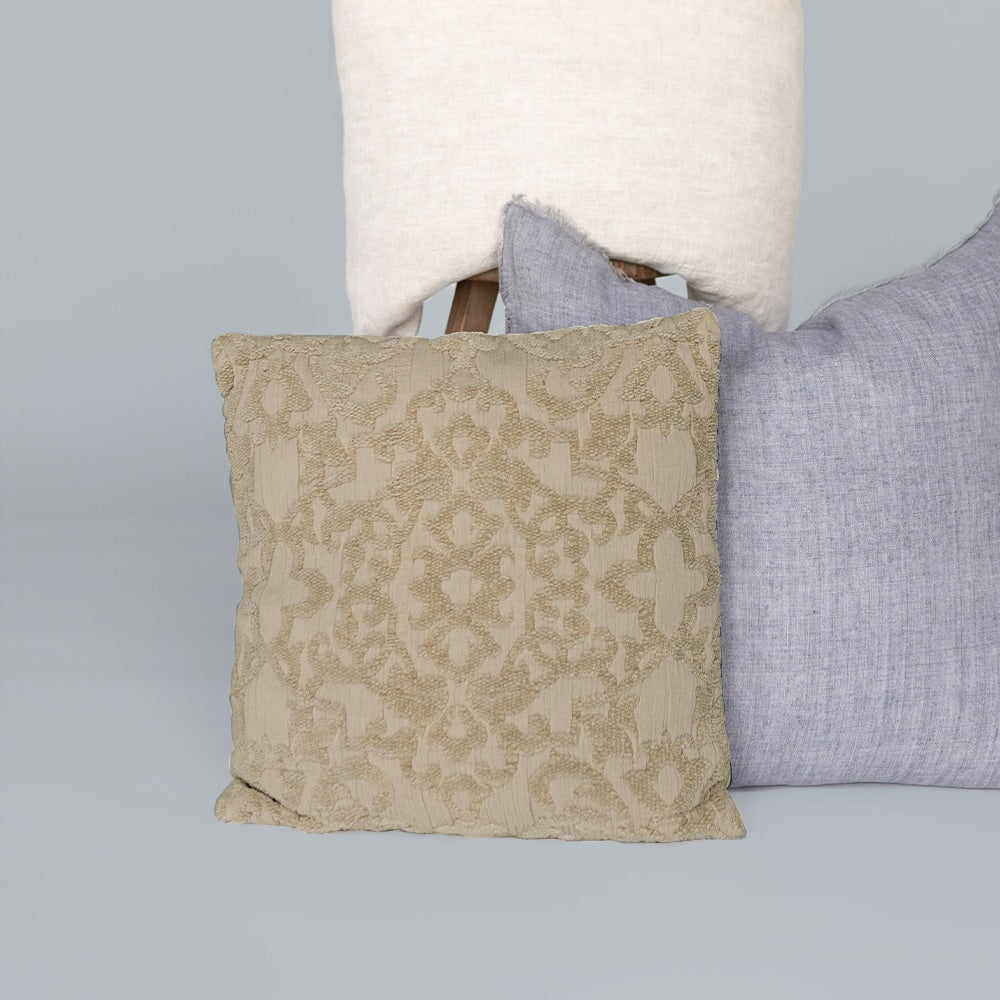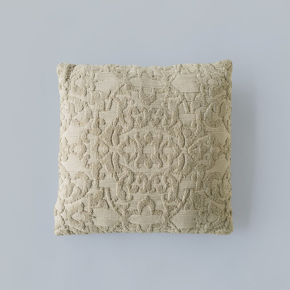 This elegant, textural throw pillow features a woven cotton chenille construction with a tufted embroidered jacquard design! It’s a green taupe colour that would look beautiful with natural decor in your home. It comes with a polyester insert and has a back zipper with a hidden flap.