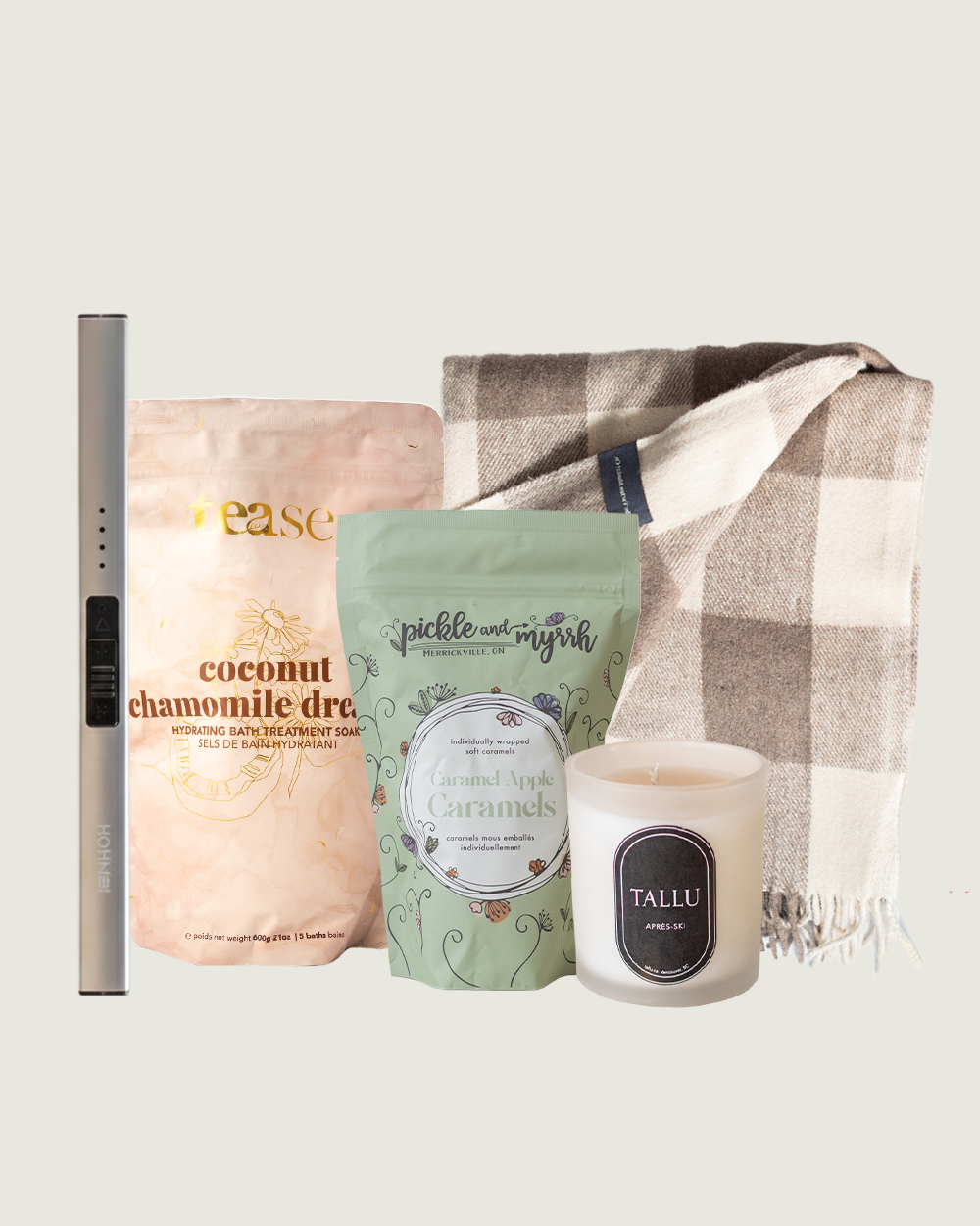 Unwind in ultimate comfort with this perfectly curated evening escape. Wrap yourself in the sustainable luxury of the TBCo Recycled Wool Blanket. Light the woodsy, soothing Tallu Apres Ski Candle using your easy-to-use HOHM and Co Rechargeable Candle Lighter (no more burnt fingers!). Sink into a hot bath with the calming, aromatic Tease Tea Coconut Chamomile Bath Soak. The perfect end to the night? A decadent Pickle & Myrr Caramels Apple treat!