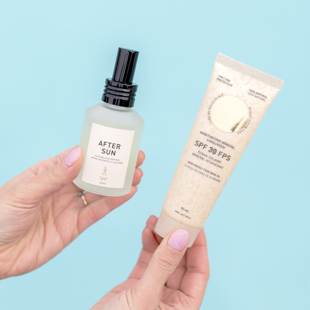 Enjoy the great outdoors while simultaneously protecting, nourishing, and soothing your skin with TANIT Suncare Duo. This set includes one moisturizing mineral sunscreen (SPF 30) and one after sun soothing aloe mist! Formulated with premium plant extracts, they are safe to use on both your face and body, and are ideal for all skin types, including sensitive skin.