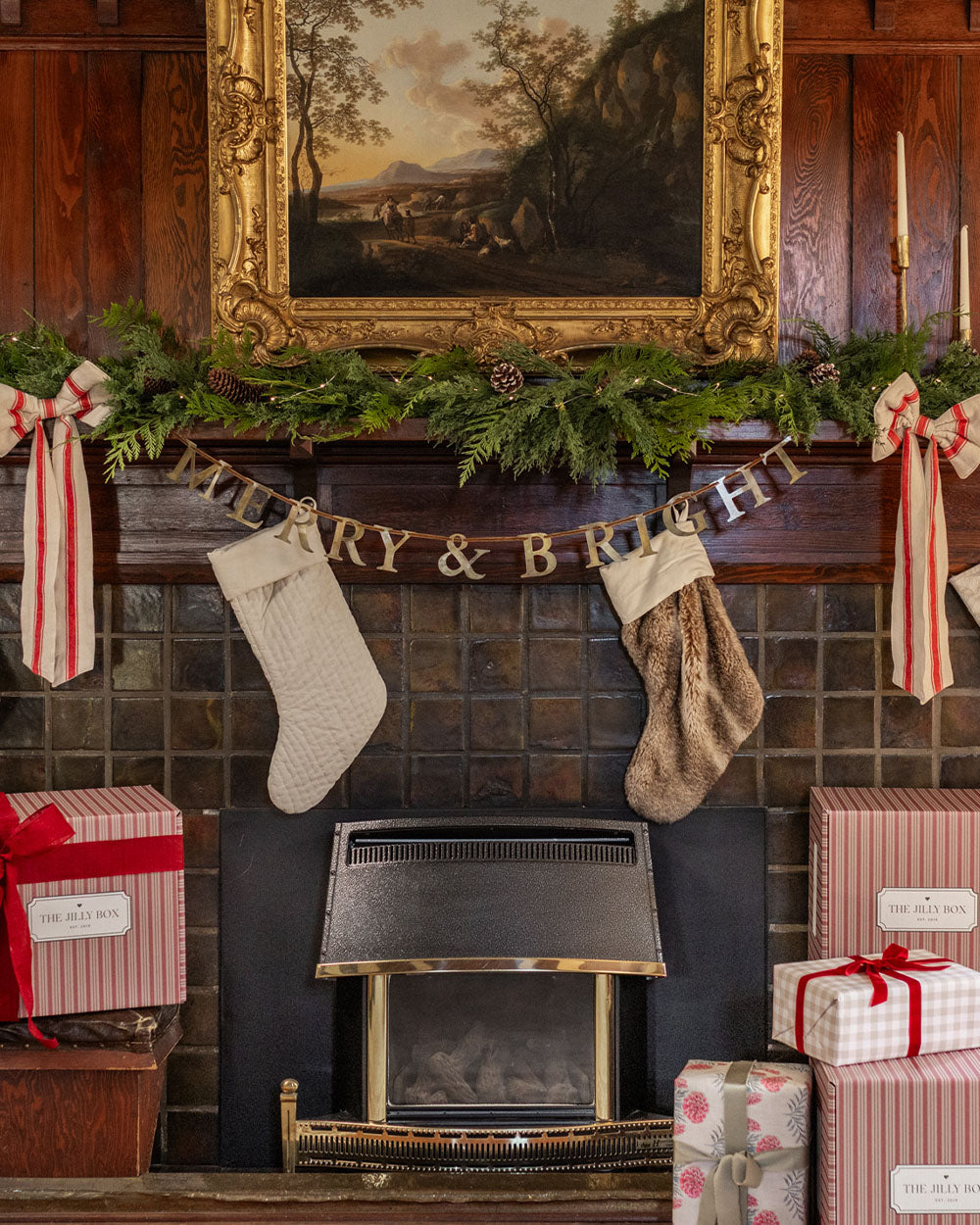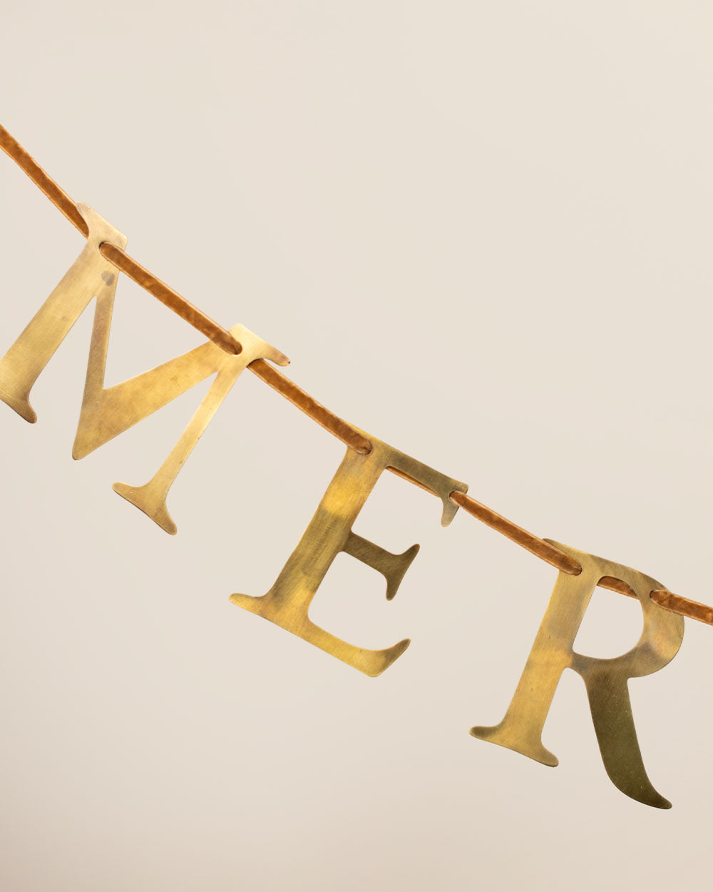 Spread a little cheer with this cutom Jilly Box Merry & Bright holiday banner. Featuring antique brass letters strung on a gold velvet ribbon, it’s a timeless holiday accent perfect for mantels, mirrors, or festive gatherings.