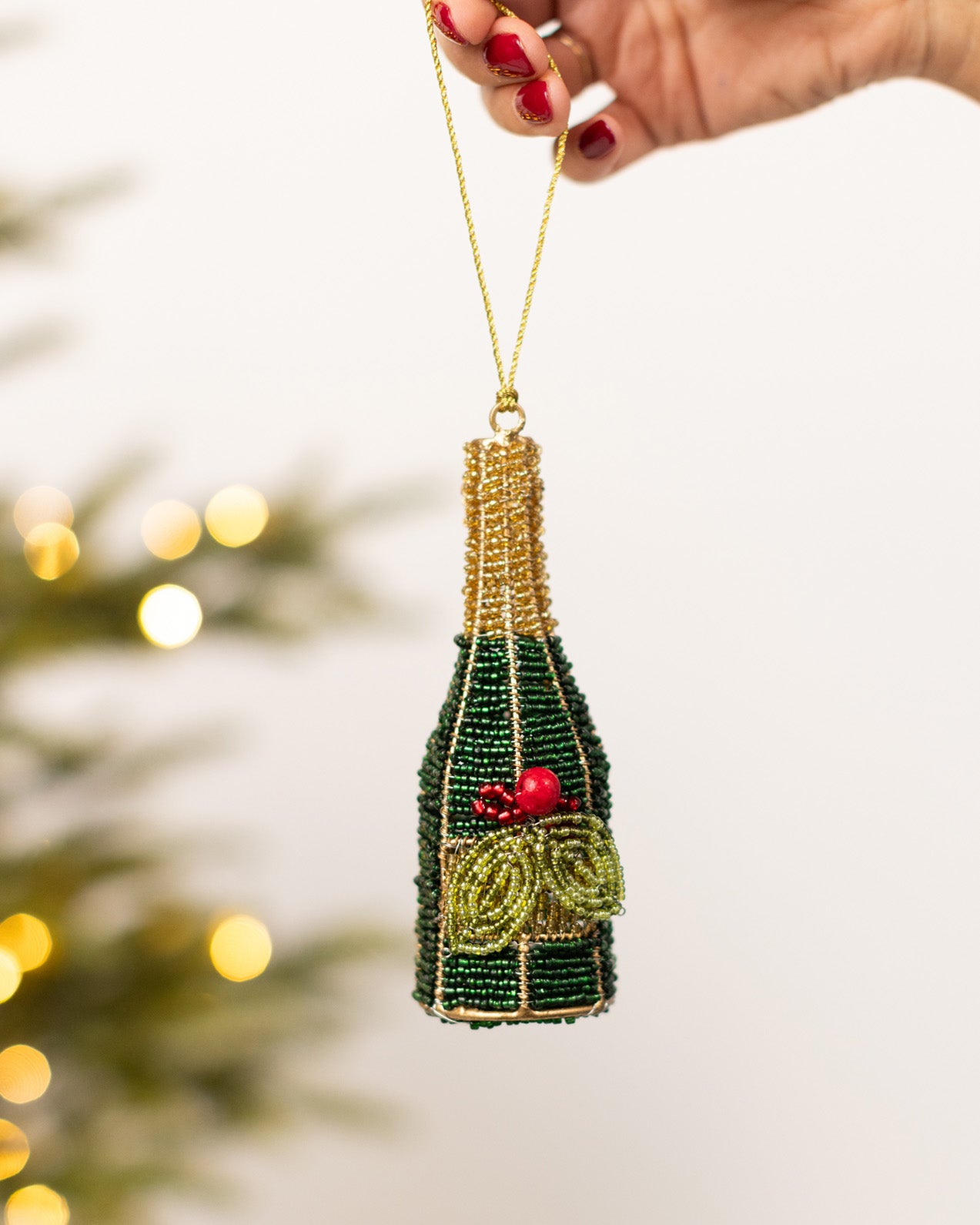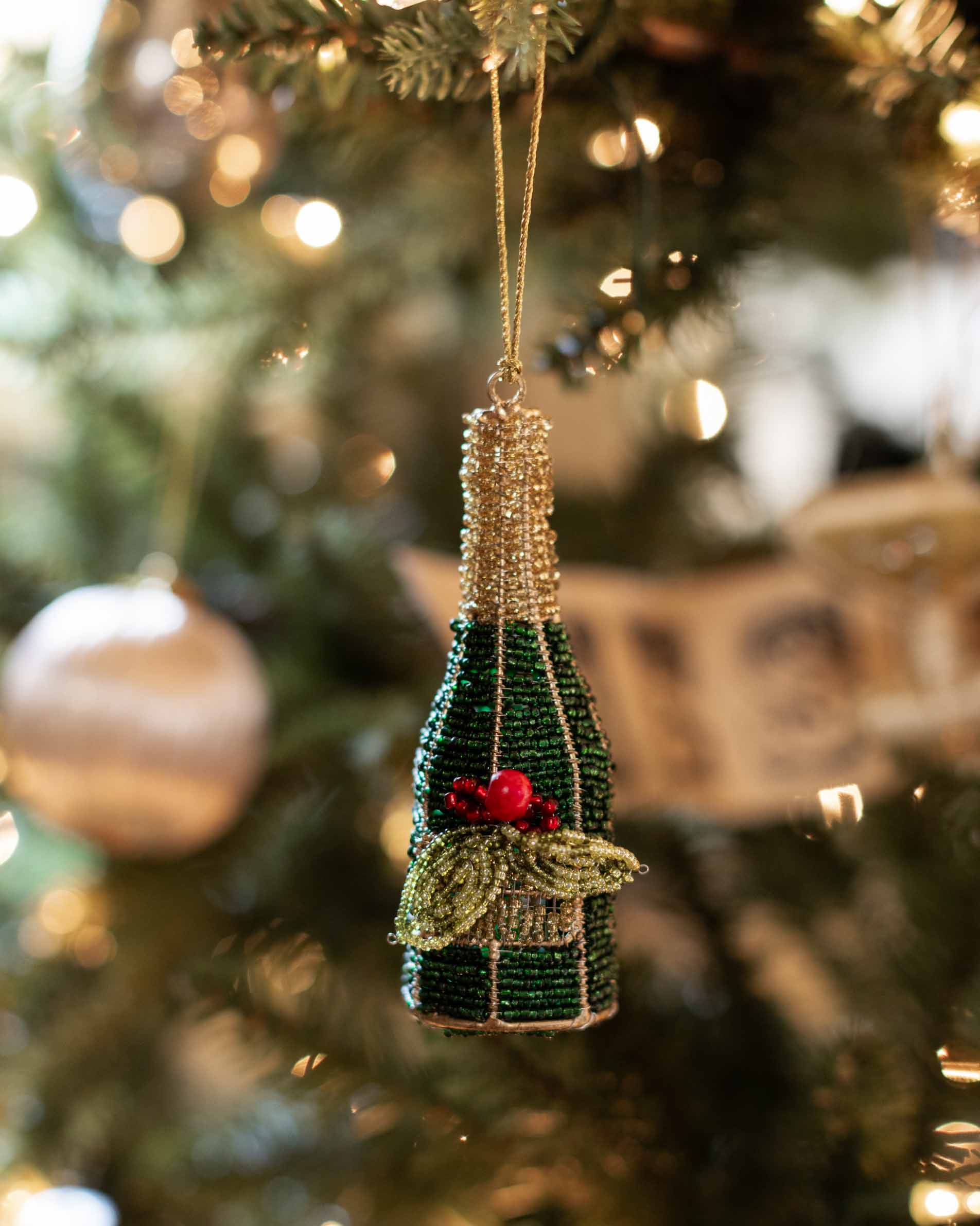 This handmade beaded champagne bottle ornament brings instant celebration to your tree. With a green bottle, gold top, and festive cranberry detail, it’s the perfect touch of whimsy and elegance.