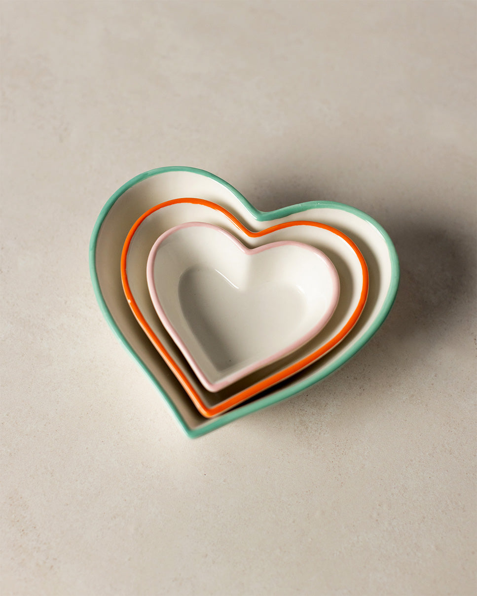 Add a touch of charm to your table with this set of 3 heart-shaped stoneware bowls. Each bowl features a crisp white finish and a colourful rim, combining playful design with practical function. Perfect for serving snacks, desserts, or small sides, these bowls bring a cheerful, versatile accent to everyday meals or special occasions. Nest them together to save space in your cupboards.