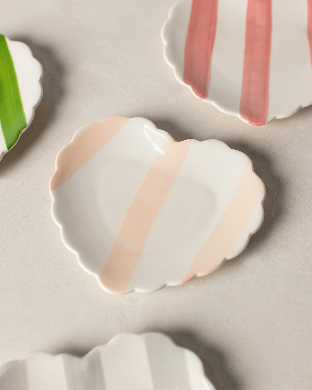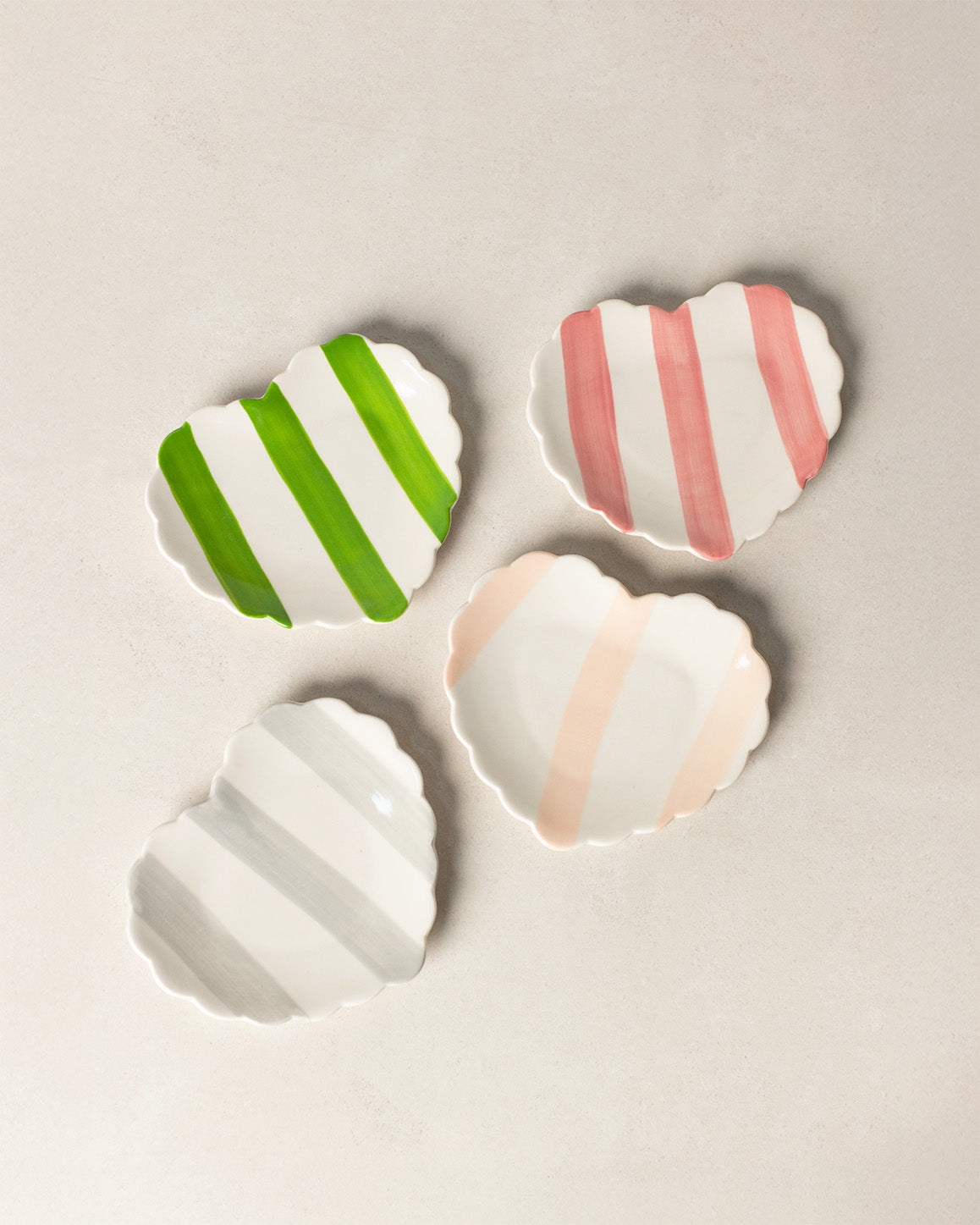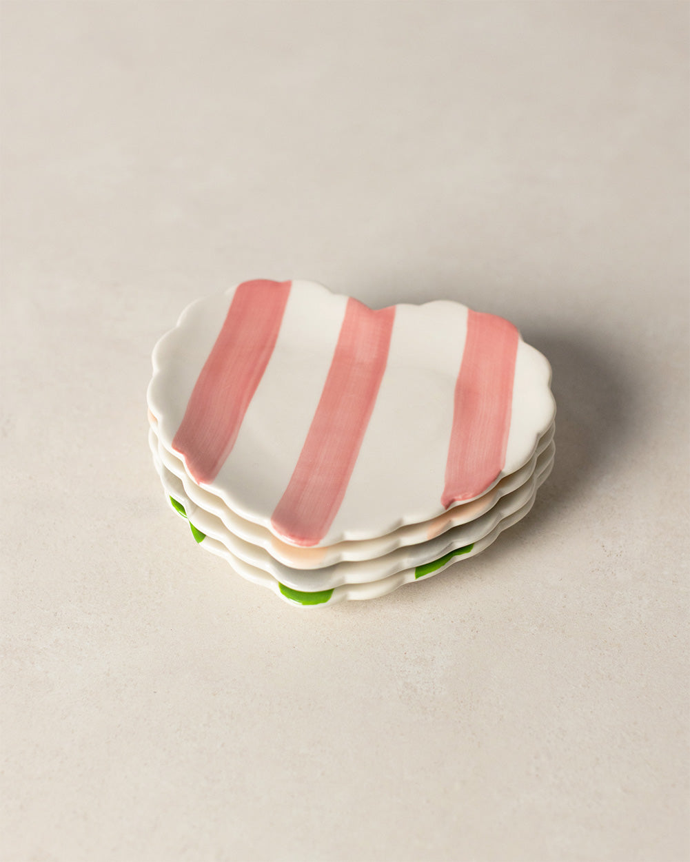 Available as a set in four vibrant colours, each dish features charming stripes and a thoughtfully crafted heart shape - perfect for snacks, desserts, or small accents on your table. Hand-painted with care, these dishes add a playful yet elegant touch to any setting, making everyday moments feel a little more special.