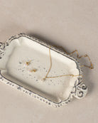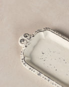 This charming painted cast iron tray features embossed edges and handles, with a distressed finish in a beautiful white colour.