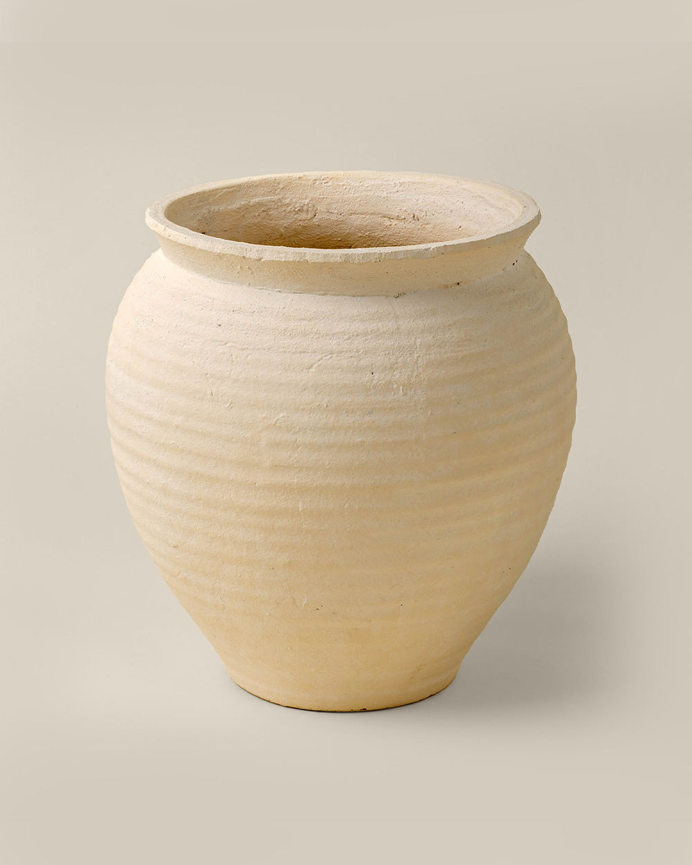 Made using traditional crafting methods, this generously sized decorative vase features a creamy matte finish and a subtle ringed texture. Hand-shaped from natural terracotta, it brings an earthy elegance to styled spaces - perfect on the floor beside a console or layered with other large vessels. While not watertight, it’s ideal for dried botanicals or can hold fresh stems with a watertight insert.