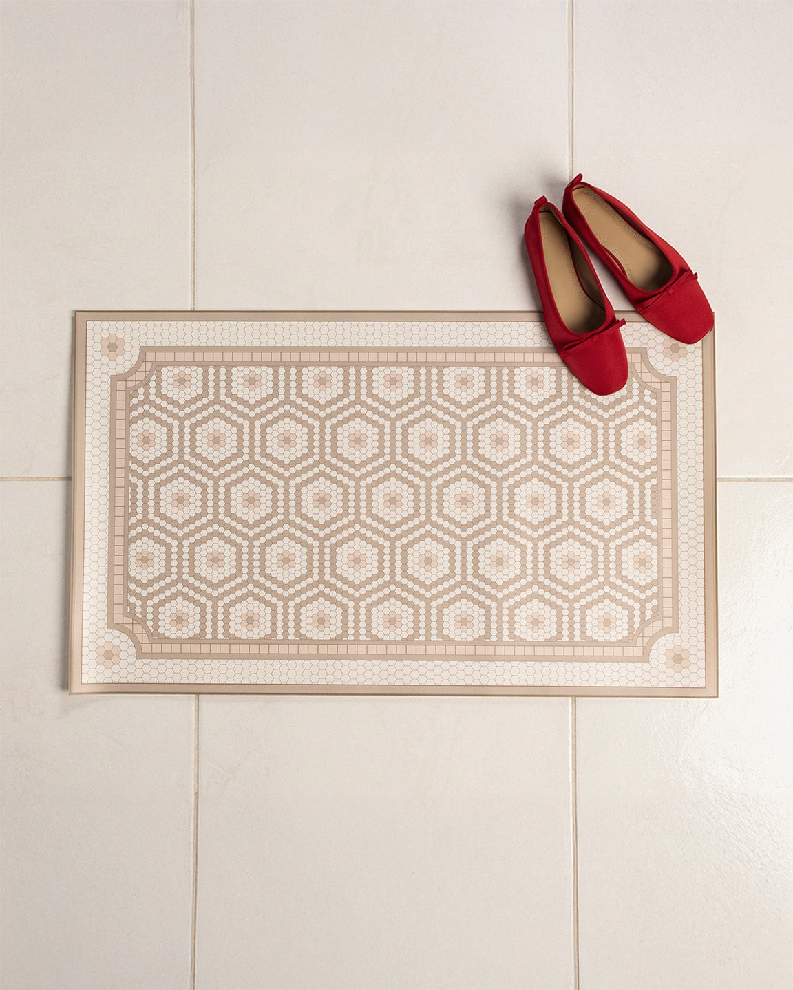 The mosaic pattern on this vinyl floor mat reminds me of stepping onto a beautiful penny-tiled café or hotel lobby floor in Paris! If I can bring that feeling home with me, I certainly will!