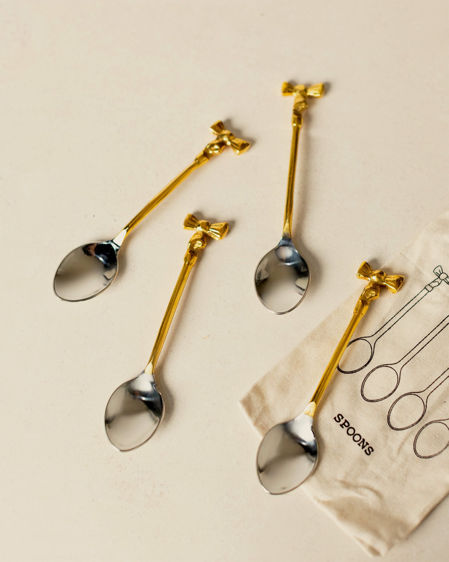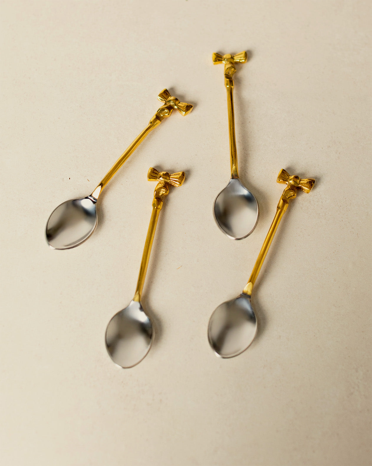 This set of four coffee spoons is crafted from stainless steel and brass and finished with delicate bow handles for a sweet, elegant touch. Perfect for coffee, tea, or entertaining, they’re as giftable as they are charming.