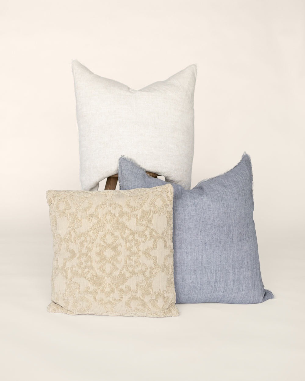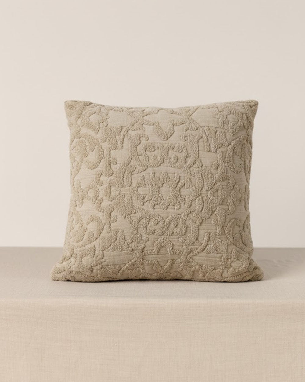 This elegant, textural throw pillow features a woven cotton chenille construction with a tufted embroidered jacquard design! It’s a green taupe colour that would look beautiful with natural decor in your home. It comes with a polyester insert and has a back zipper with a hidden flap.
