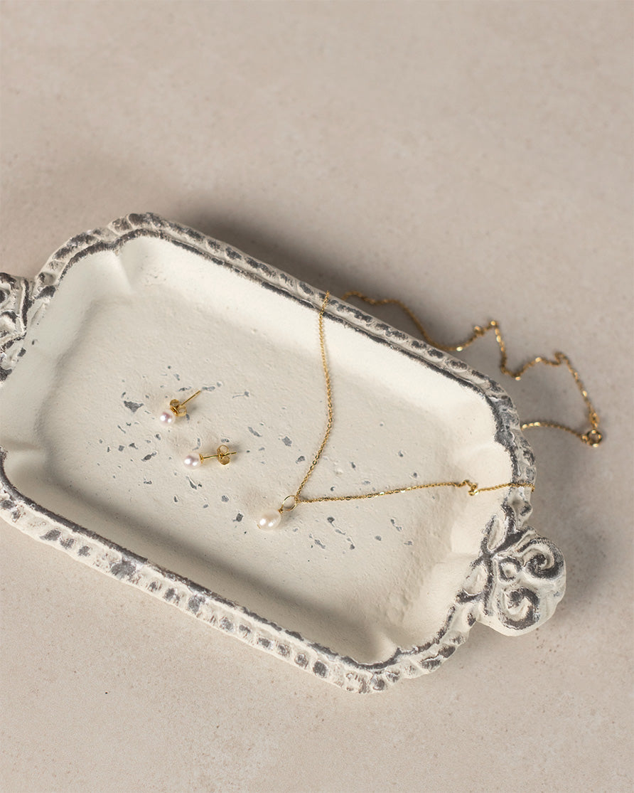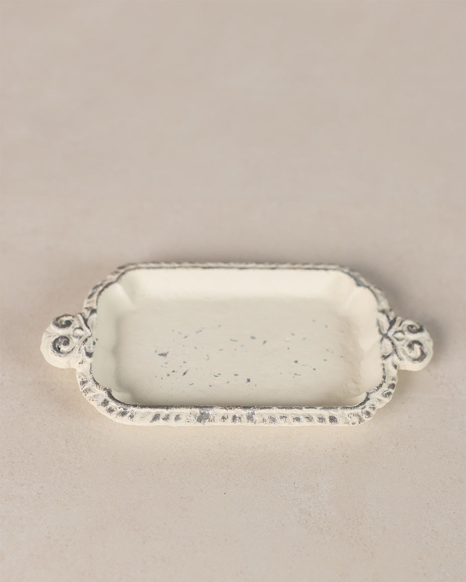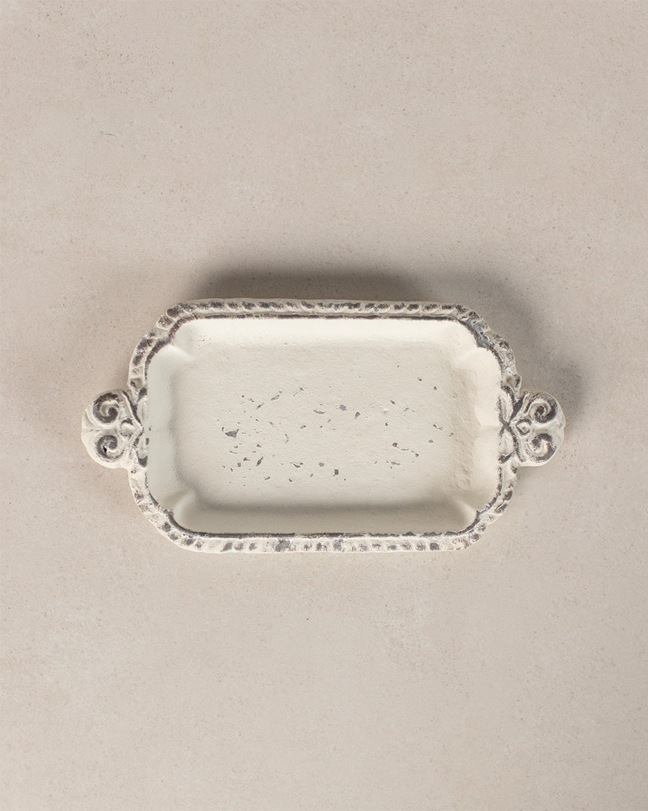 This charming painted cast iron tray features embossed edges and handles, with a distressed finish in a beautiful white colour.
