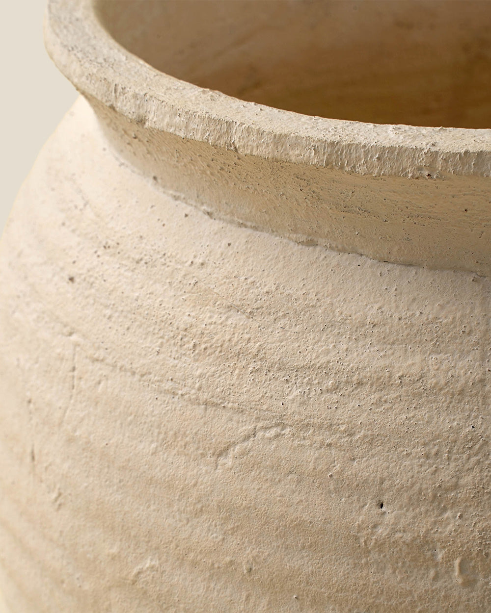 Made using traditional crafting methods, this generously sized decorative vase features a creamy matte finish and a subtle ringed texture. Hand-shaped from natural terracotta, it brings an earthy elegance to styled spaces - perfect on the floor beside a console or layered with other large vessels. While not watertight, it’s ideal for dried botanicals or can hold fresh stems with a watertight insert.