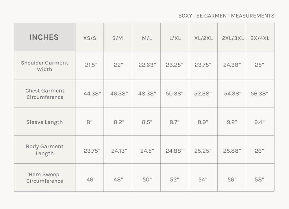 HOW IT FITS: The Boxy Tee features a wide-cut body that hits right at your hips, offering a relaxed, truly oversized fit with a perfectly cropped silhouette. We recommend staying true to size, but refer to the sizing chart below to find the fit that works best for you.