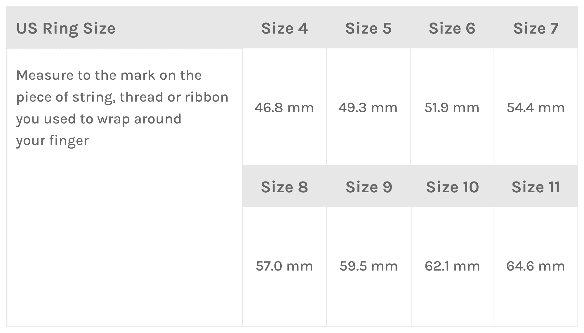 Get a string, thread or ribbon and wrap it around the finger and the position you intend to wear the ring on (if you will stack or wear it above the knuckle, consider where on your finger the ring will sit). Make sure it is snug around your finger so that it’s comfortable and not too tight. Use a marker to mark the string where it meets. Lay your string on a flat surface and use a ruler to measure the length up to the mark. Use the table below to find your ring size.
