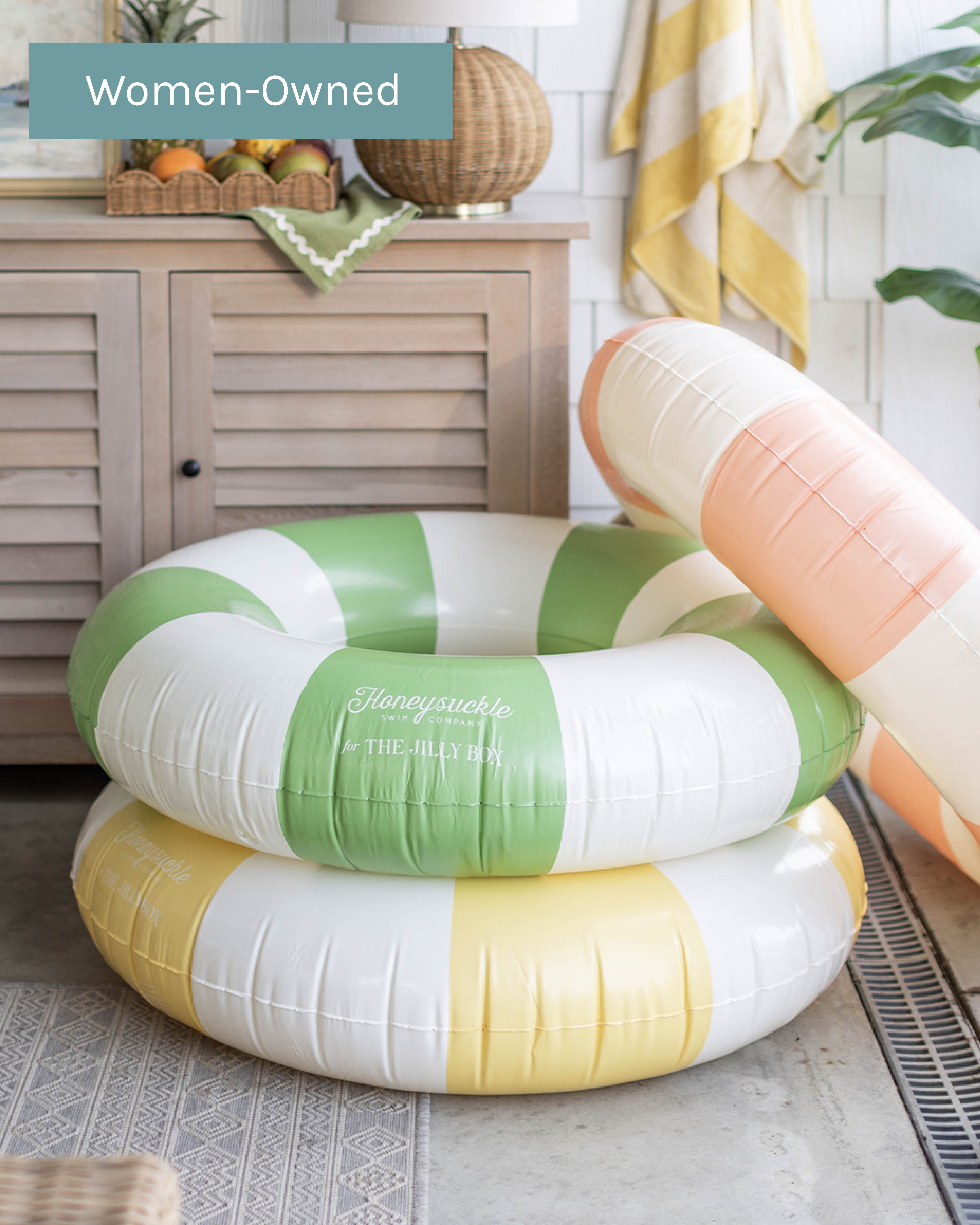 Meet your new summer staple: the oversized adult pool float by Honeysuckle Swim Co. Designed for maximum comfort and major style, it comes in three custom Jilly Box colourways - yellow, coral, and green.