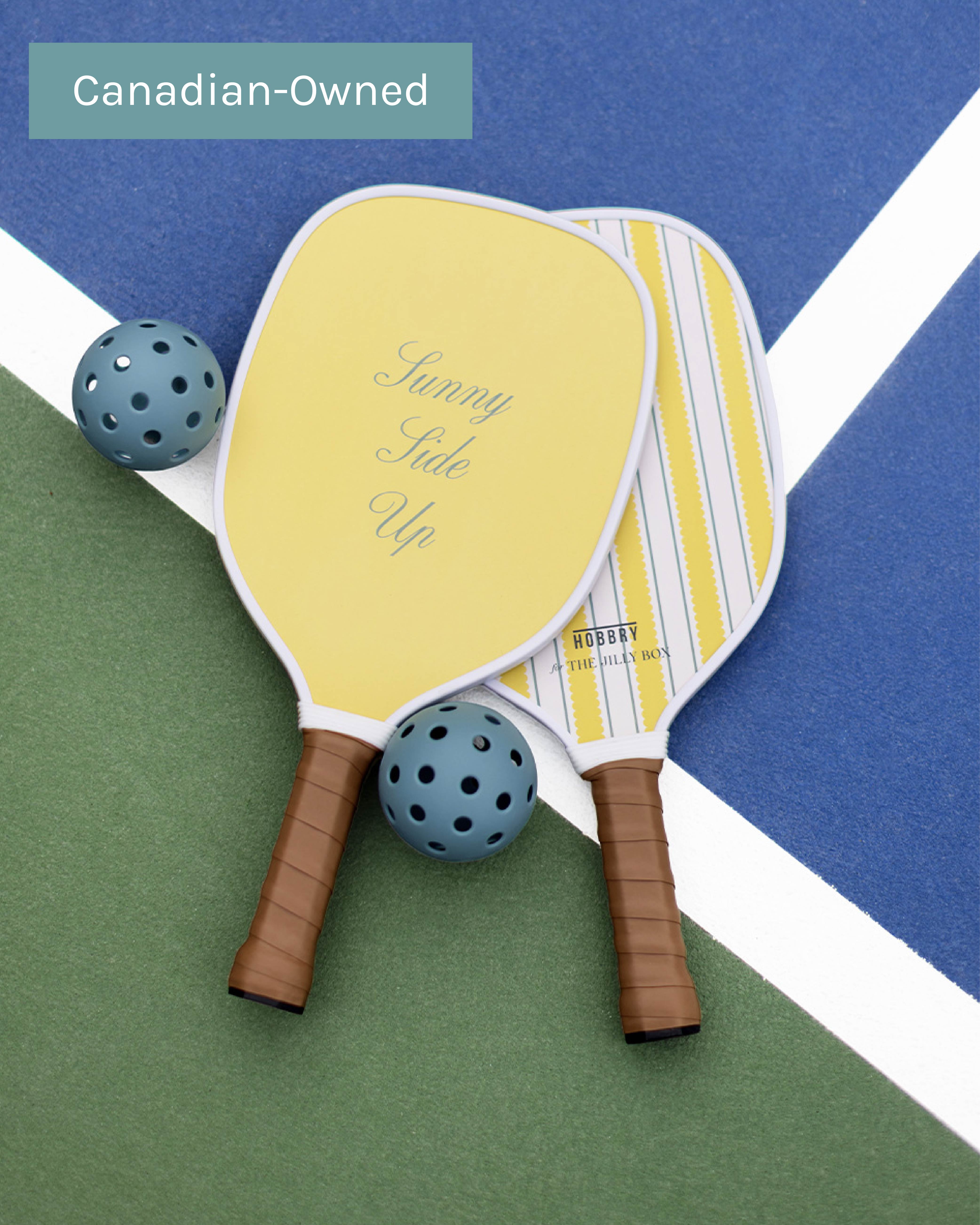 This limited-edition set comes complete with two custom Sunny Side Up striped paddles, two color-coordinated balls, and a matching carrying case with a zipper and strap for easy transport.