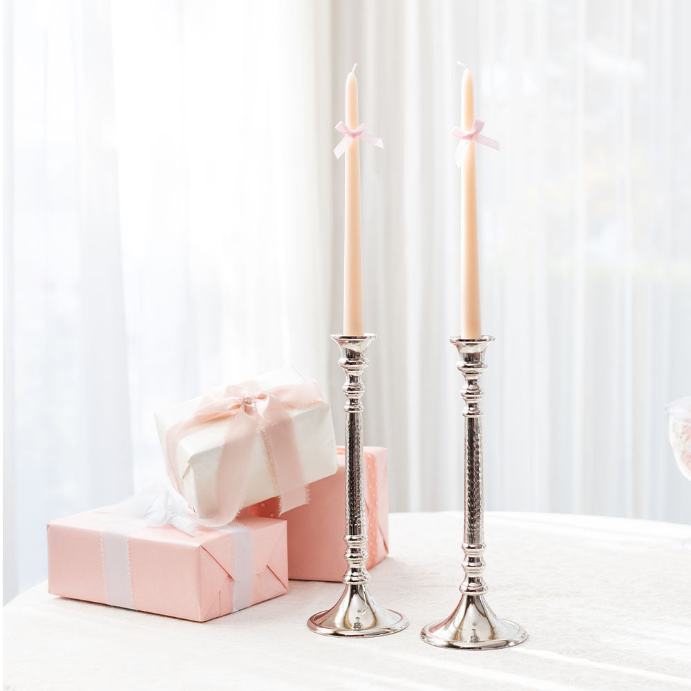 These hand-blown glass candlesticks offer a beautiful and unique way to illuminate any room! Each set includes a large and small candlestick. They are designed to fit a standard-sized candle. Both custom colours—Pink and Pearl—have a stunning iridescent finish. Add a little shine and luminance to your decor this season! *Please note: Due to the handcrafted nature of this product, size and shape may vary slightly from piece to piece.