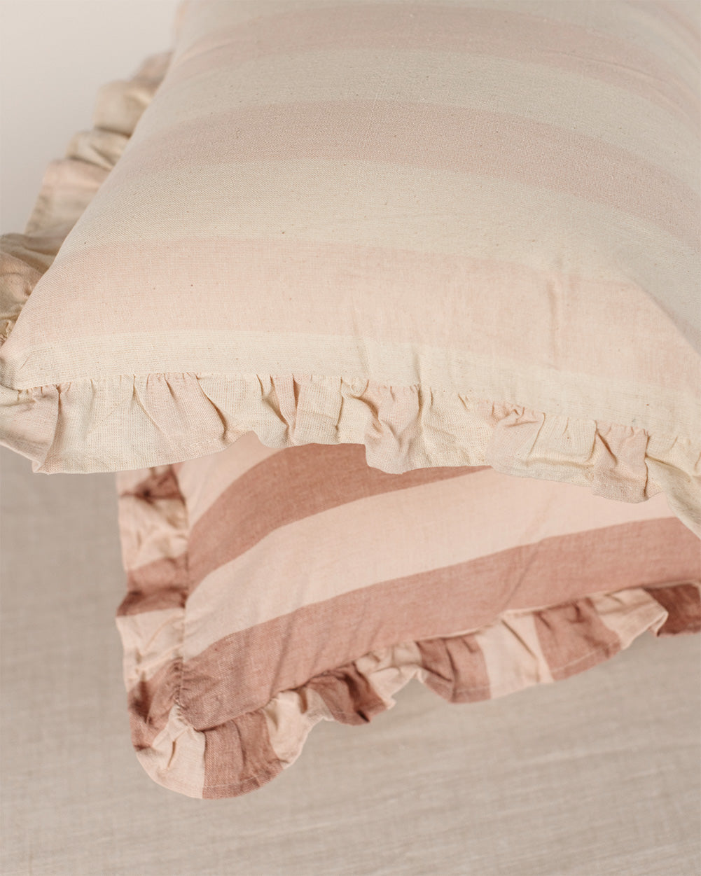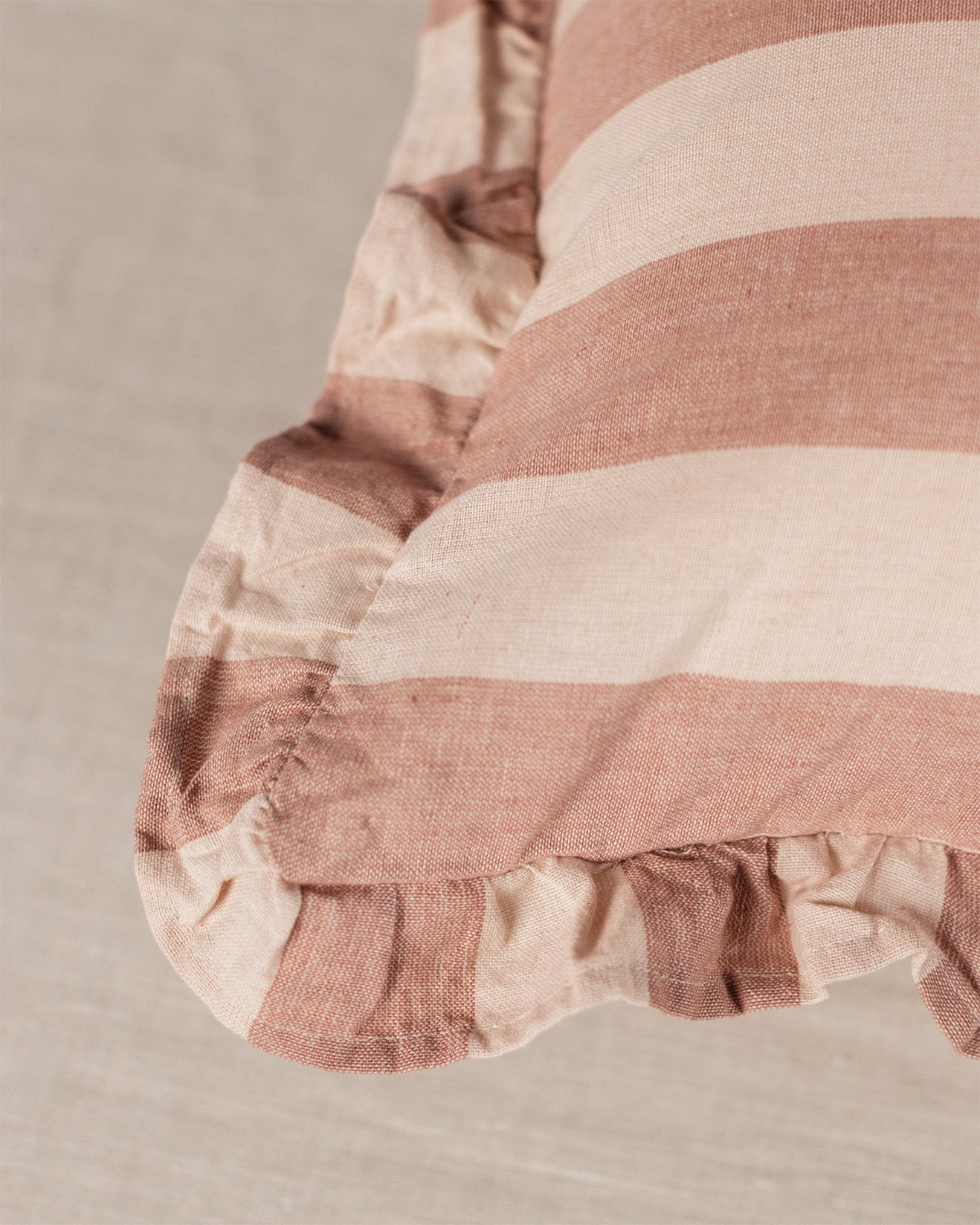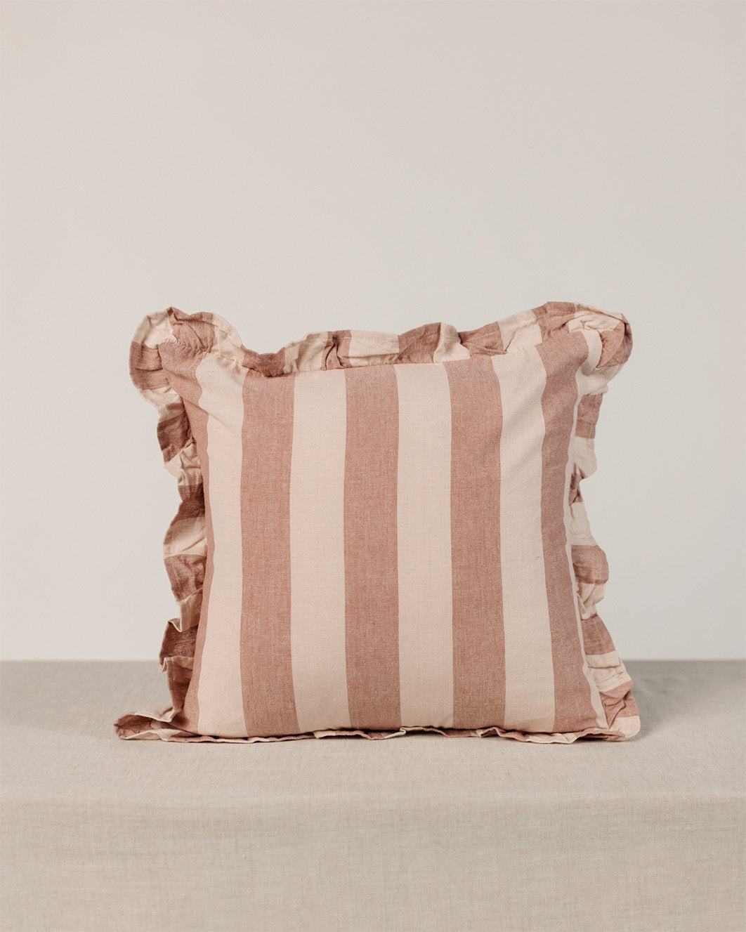 This beautiful cushion features bold stripes and a delicate ruffled edge. The classic stripe pattern makes this cushion a versatile piece that mixes effortlessly with other pillows and patterns. Soft, breathable cotton ensures comfort, while the ruffled detailing adds a subtle charm - perfect for layering on sofas, chairs, or beds for a polished, curated look.