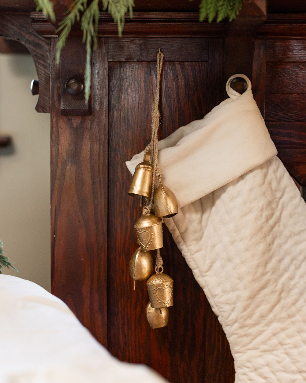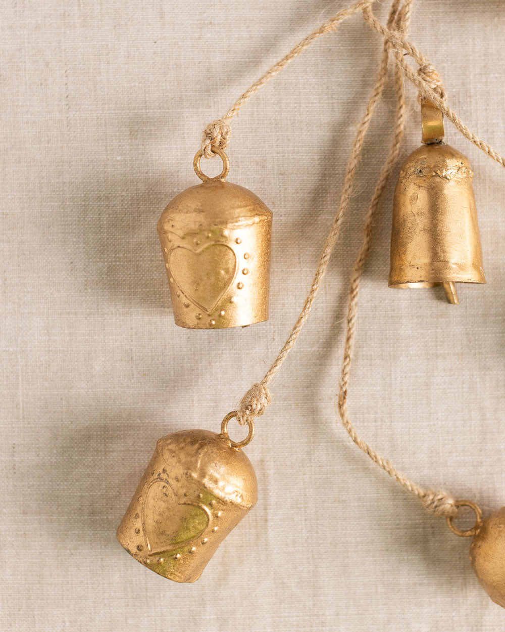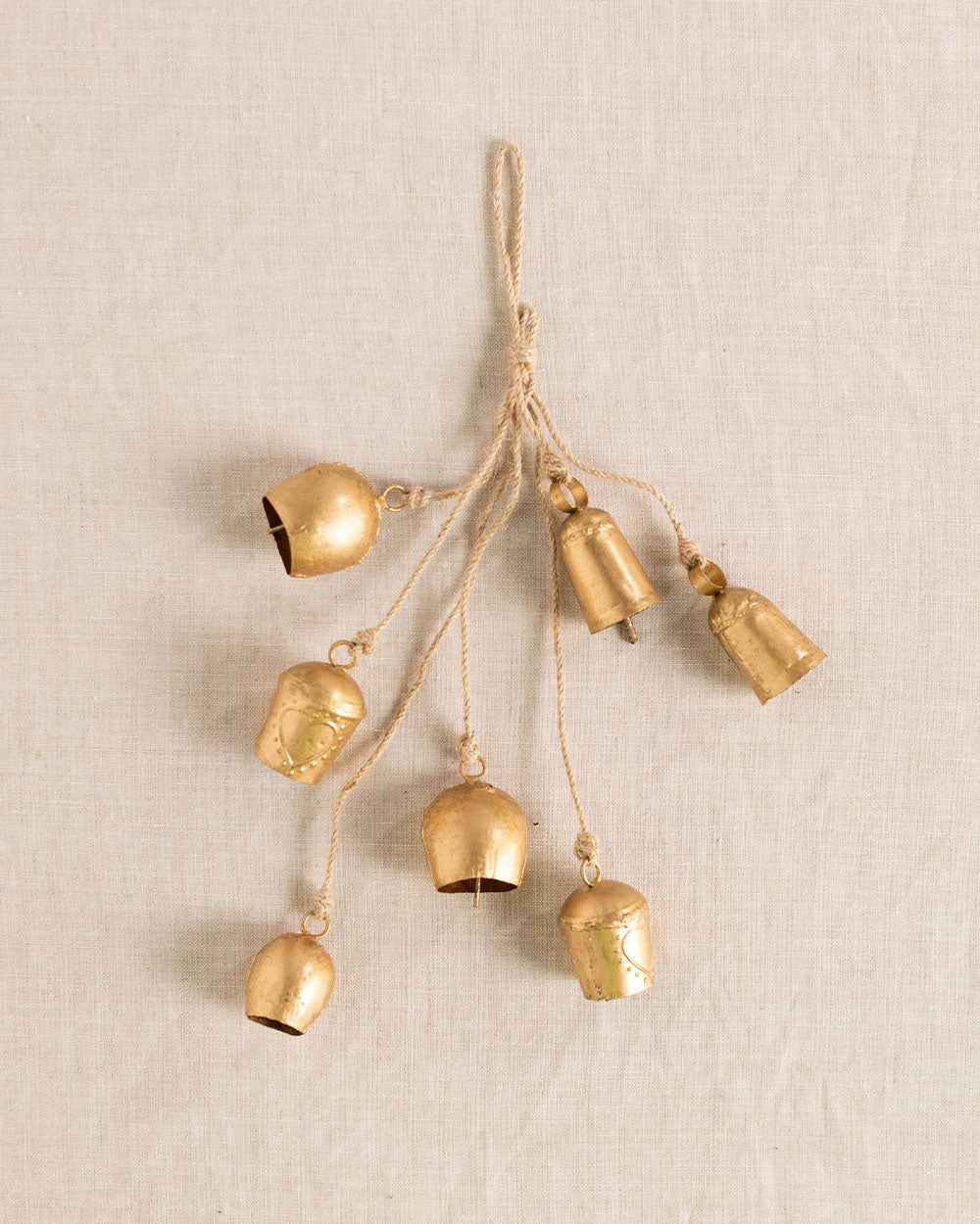 This stunning set of mixed Jinglebells adds instant holiday charm to any space. The warm metallic finish and natural jute tie make it easy to hang on a mantle, door handle, wreath, or stocking hook. With a variety of bell shapes and sizes, it feels thoughtfully collected and artisanal, perfect for elevating your décor with texture, movement, and a subtle festive shimmer.