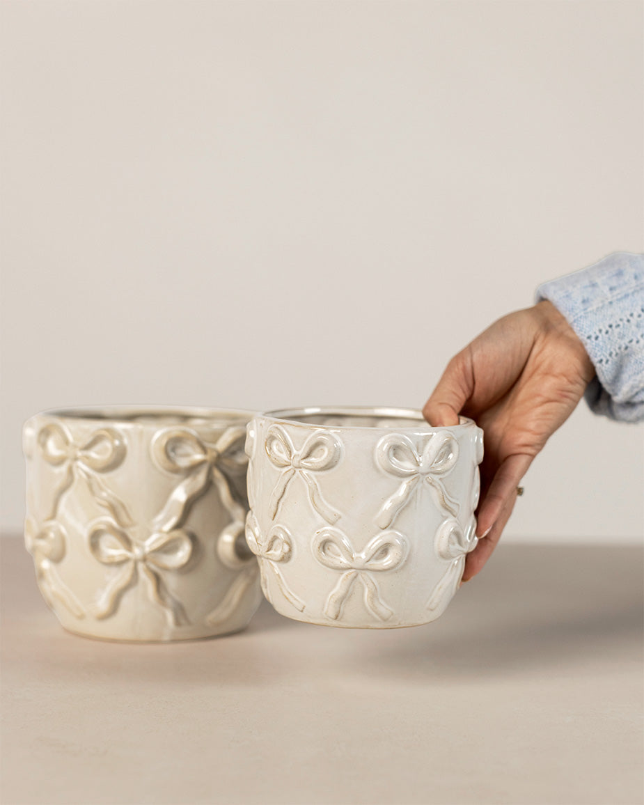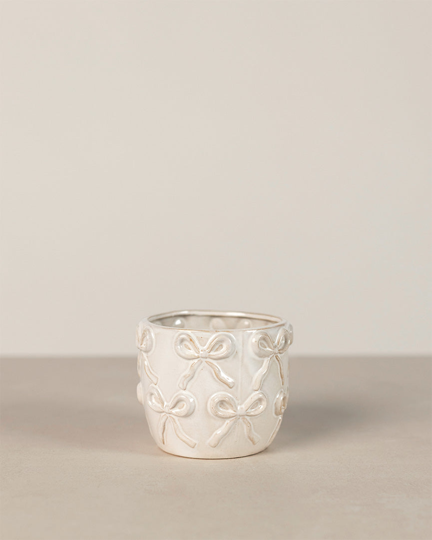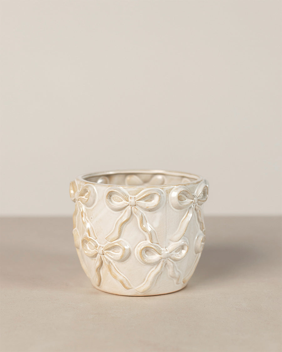This stoneware planter is surrounded in a pretty pattern of monochromatic bows and will add a touch of whimsy to any home or office space.