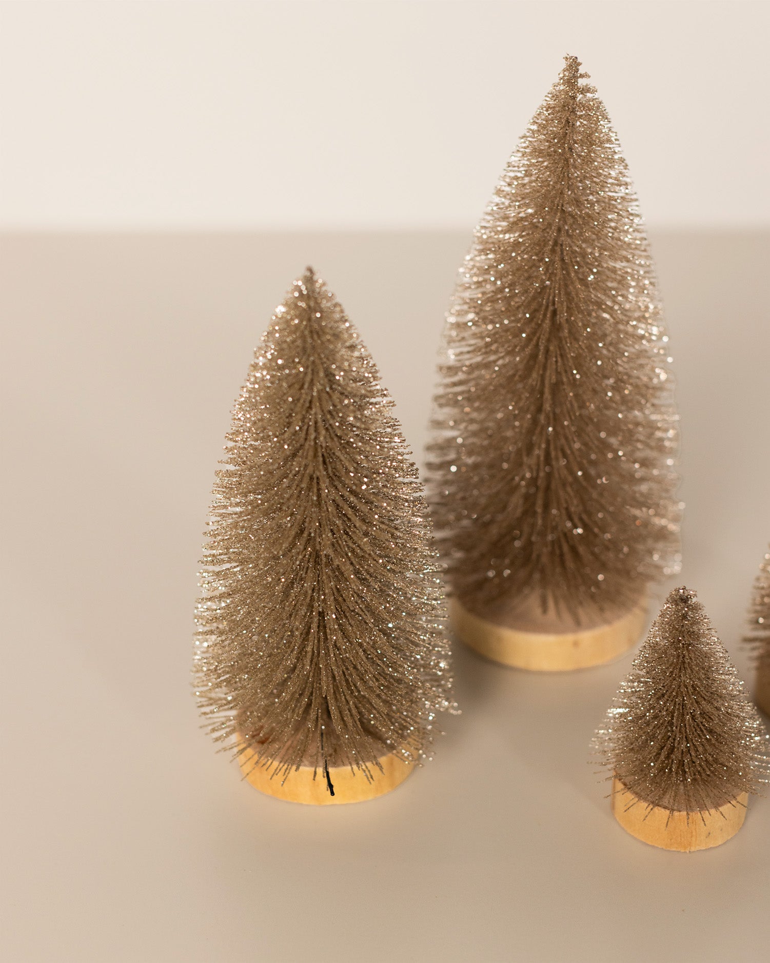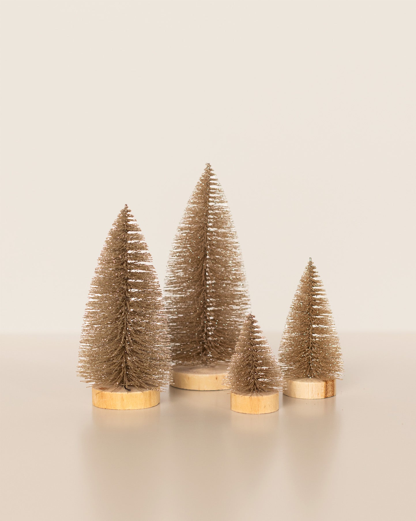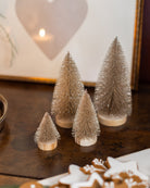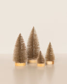 This set of four glittering gold bottle brush trees is perfect for styling Christmas villages, mantels, or festive tablescapes. Each tree stands on a wooden base, adding a touch of magic to any display.