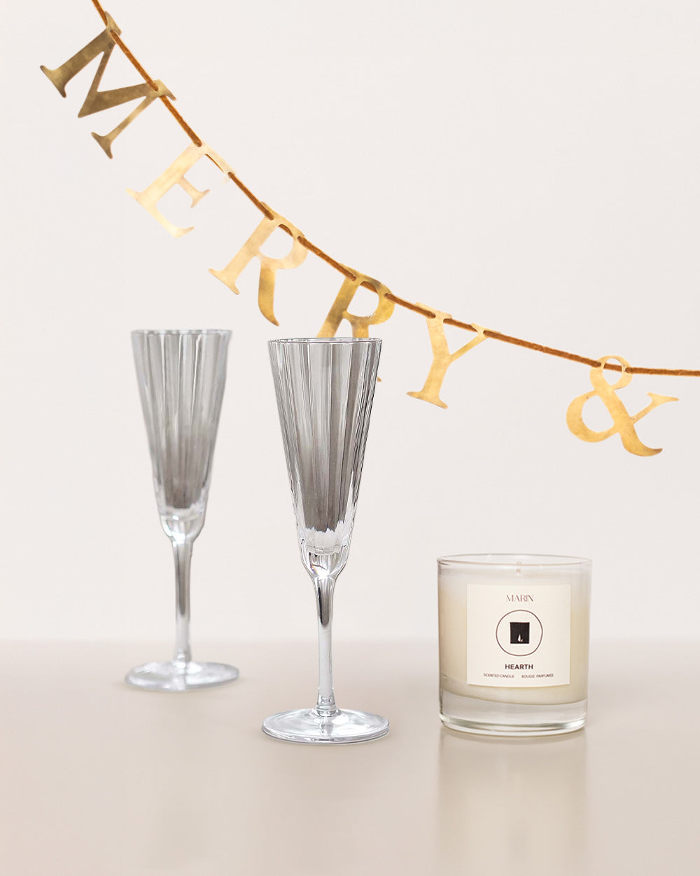 Create a warm and welcoming holiday atmosphere with this thoughtfully curated trio of seasonal favourites. Set the tone with a Marin Hand-Poured Candle, in the scent Hearth, made with clean-burning, natural ingredients that fills your home with the coziest winter fragrance. Add a touch of festive charm by draping the Jardines Domaine HOME Holiday Banner across your mantel, mirror, or entryway—its antique brass letters and gold velvet ribbon bring instant joy to any space. And when it’s time to raise a glass, celebrate the season in sparkling style with The Cross Sparkle Flutes, perfect for champagne, prosecco, or your signature holiday spritz. This bundle brings together elegance, warmth, and joyful details to make every gathering feel special.