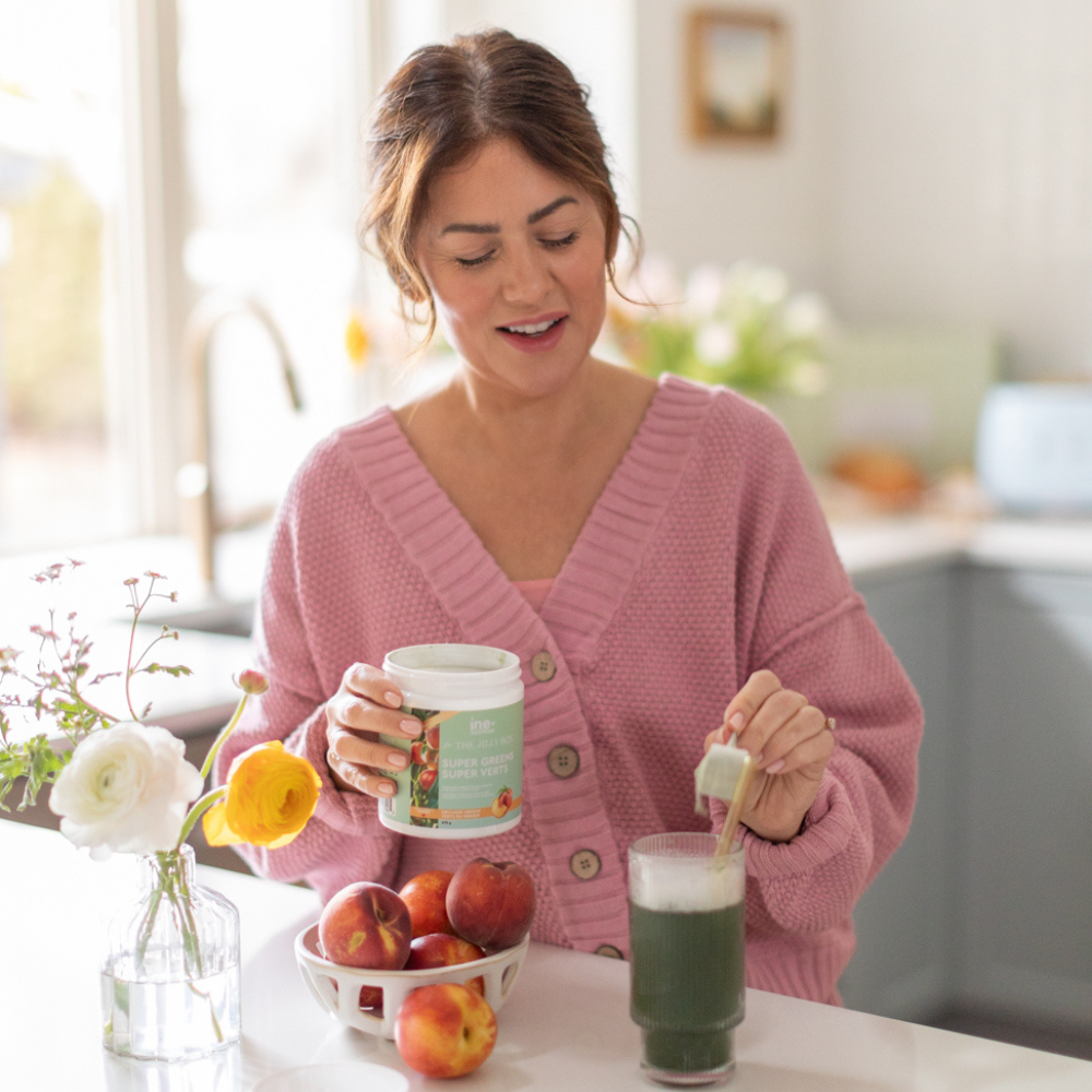 Have you heard of this greens powder that is Jillian's new morning go-to?! Introduce Super Greens Powder from ine+ nutrition! This is a CUSTOM ‘Orchard Peach’ flavour that our team is obsessed with. The powder is intended to improve gut health, better-focused energy, alertness, vitality, mental clarity and support for brain health. Who doesn't want more of that?! Simply scoop (10 g) and dissolve in a 250 ml glass of water or smoothie, and enjoy!