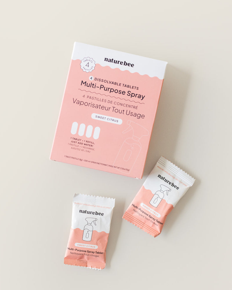 Sweet Citrus Multipurpose Spray Kit: a 500 ml glass spray bottle with a dissolvable cleaning tablet to tackle messes with fresh, citrusy power.