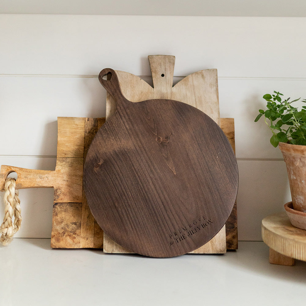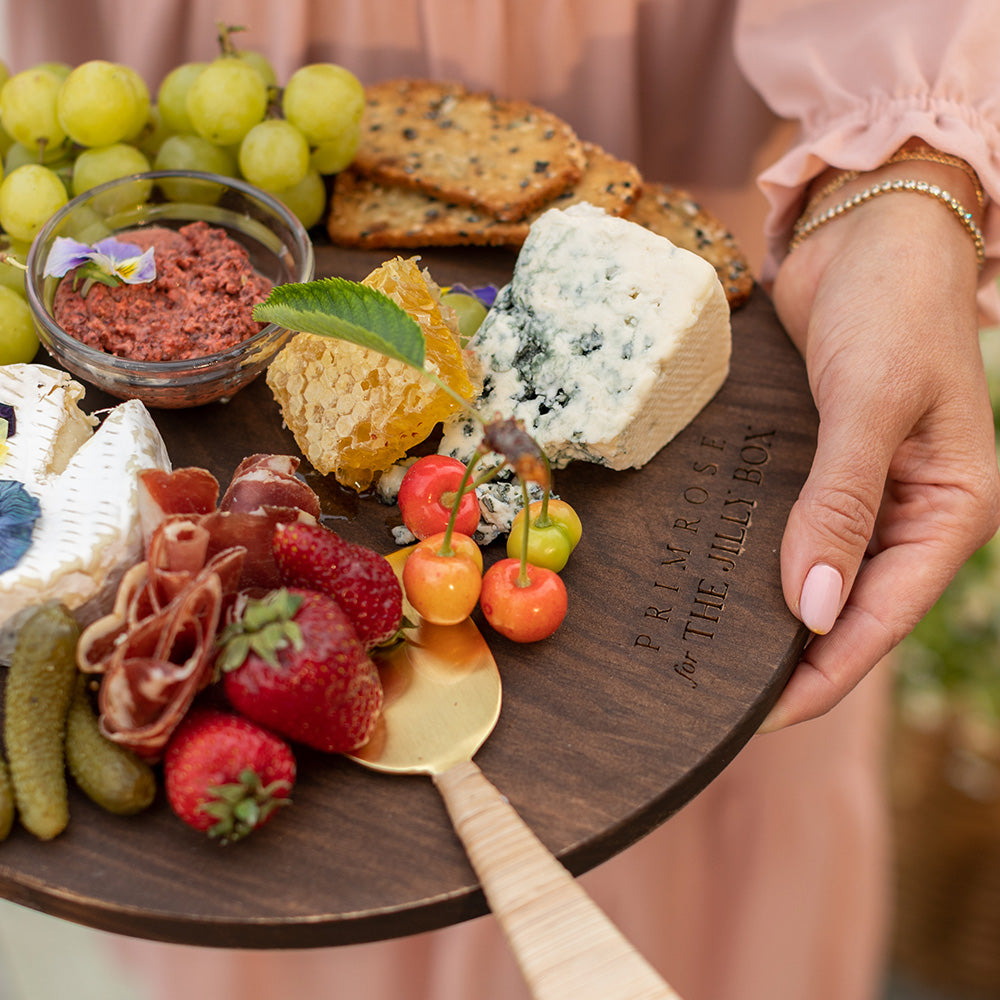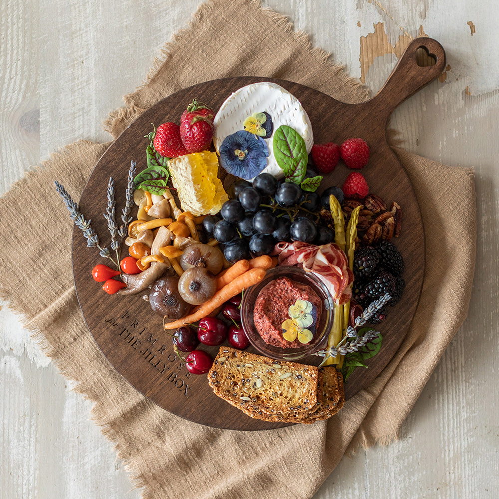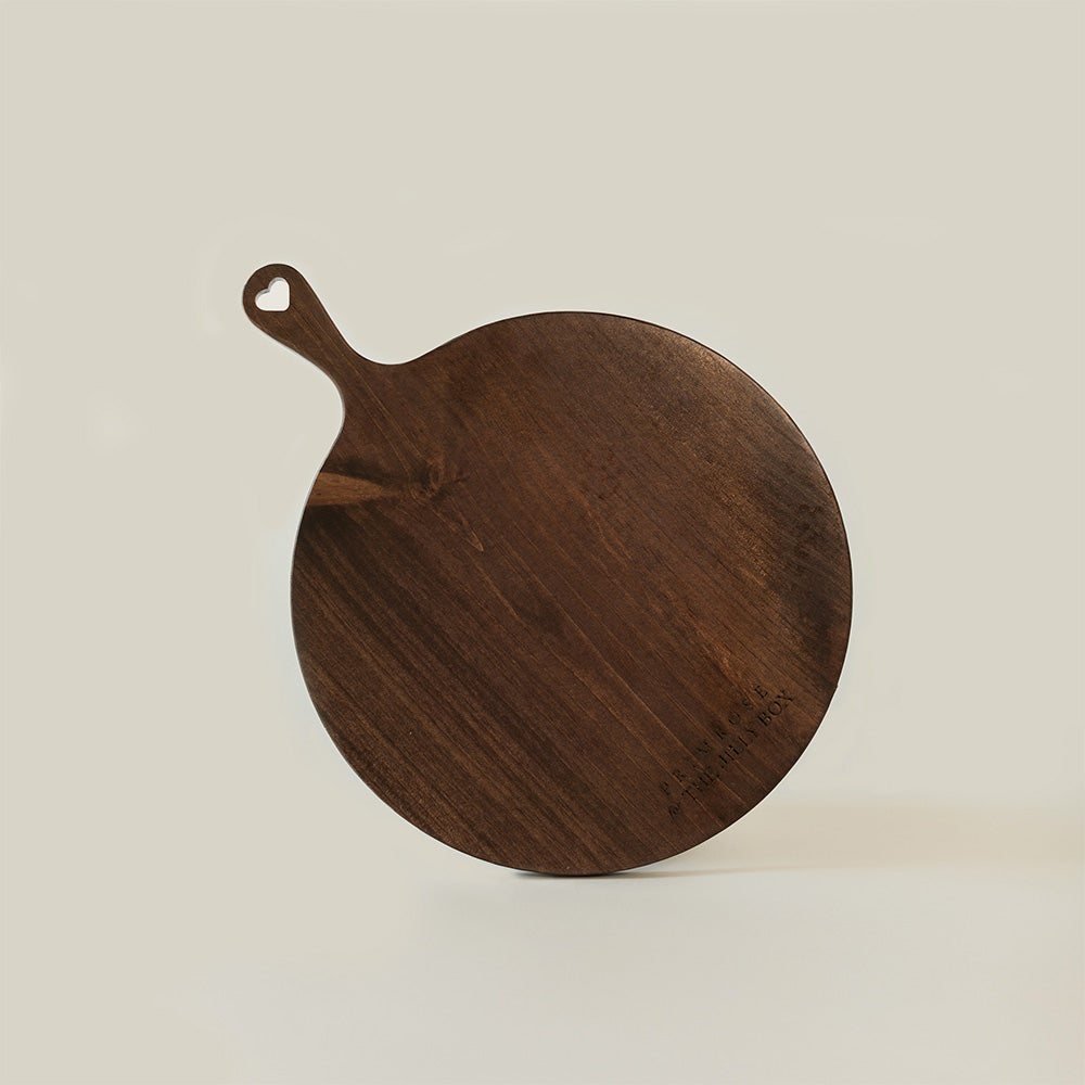 A Jilly Box custom piece! This stunning handcrafted wood serving board is made with locally sourced Canadian pine and finished with a rich walnut stain; no two boards are identical and this timeless piece only gets better with age! Take note of the adorable heart cut-out feature that will give your next charcuterie the perfect finished look!
