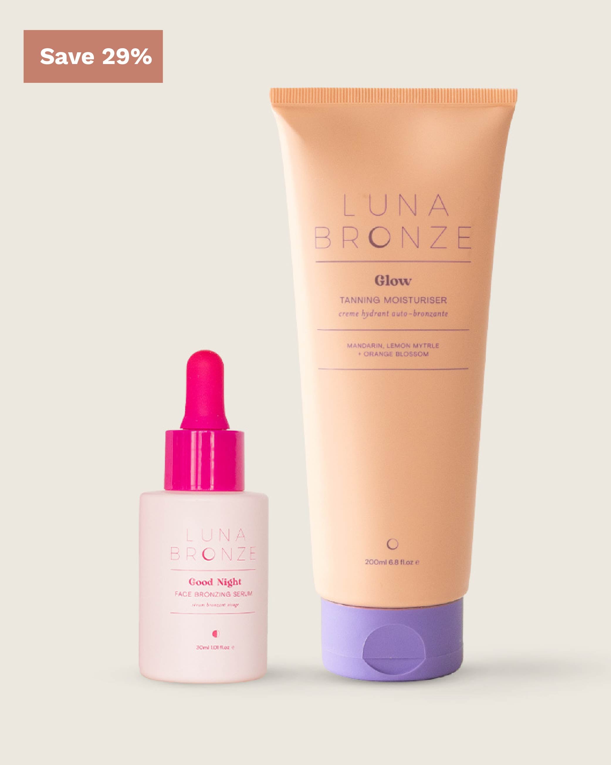 Get glowing bronzed skin with this Sun-Kissed bundle from Luna Bronze. This dynamic duo includes the Gradual Tanning Moisturizer, a nourishing body lotion that builds a natural-looking, sunless tan while deeply hydrating your skin. Paired with the Good Night Face Bronzing Serum, this gentle overnight formula works while you sleep, giving your complexion a radiant, even glow by morning. Formulated with skin-loving ingredients, this bundle is your new go-to for a healthy, streak-free tan, no sun required.